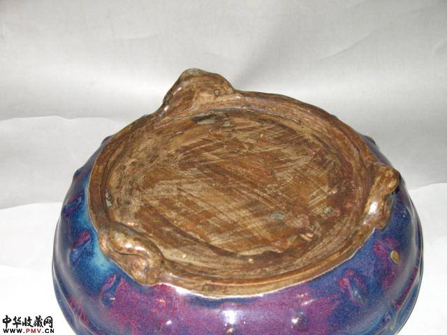 品相:极美品!此北宋钧窑三足鼓钉洗,尺寸:口径26厘米,足径19厘米,高9厘米,价格面仪!藏品特征:敞口,浅弧壁,外壁口沿下和近底部均装饰鼓钉一周,分别为18枚和18枚。平底,有护胎釉,带10个小支钉,下承以三个如意头形足。外底刻有标明器物大小的数目字“二”。通体内外施釉,内施天青色釉,外壁釉色红中泛紫,呈现蚯蚓走泥纹;绚丽夺目。(俗称:钧窑带紫,价值连城) 鼓钉洗是钧窑瓷器中常见的造型品种,这种富于装饰性的器物配以如意头形足活泼轻巧,匠心独具。此为宋代宫廷陈设用瓷。陈韵至 QQ851555640邮箱