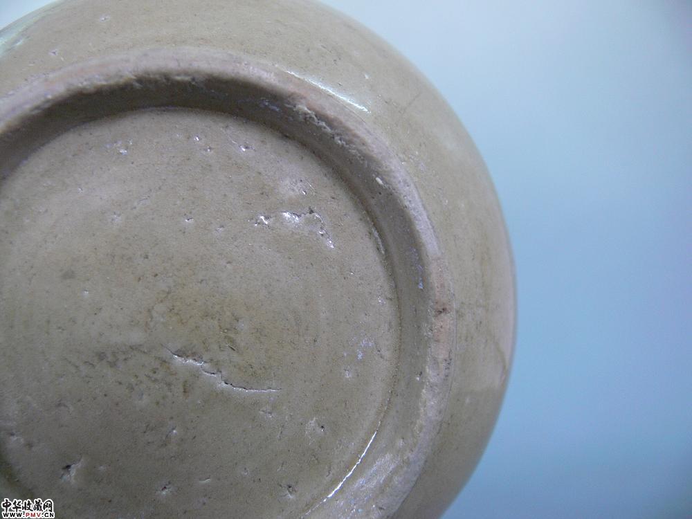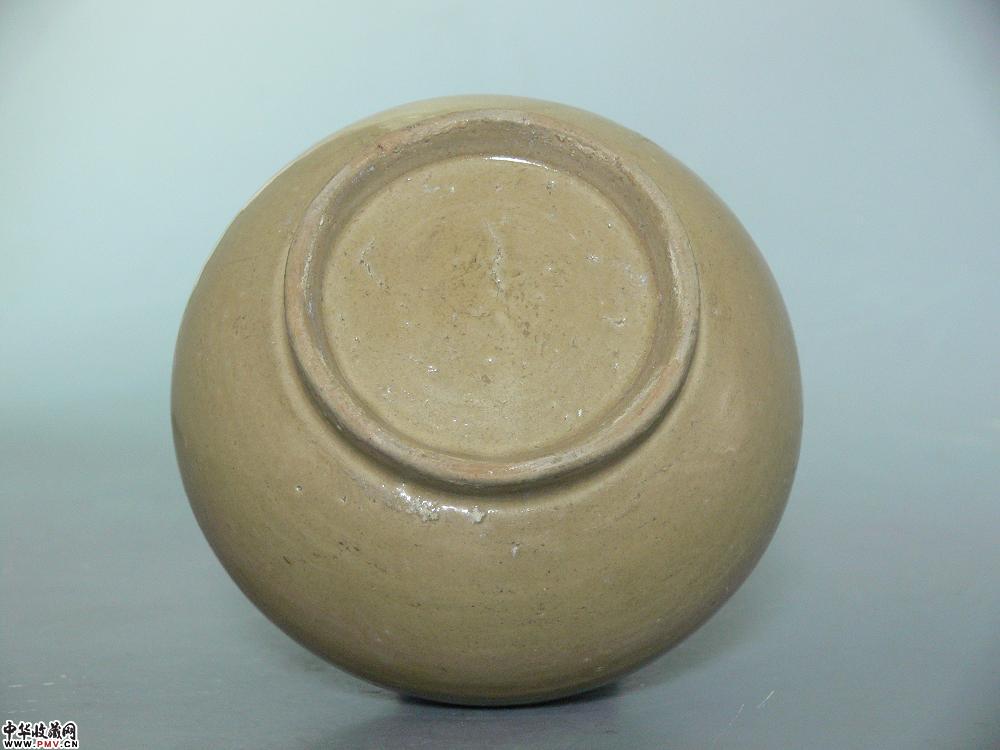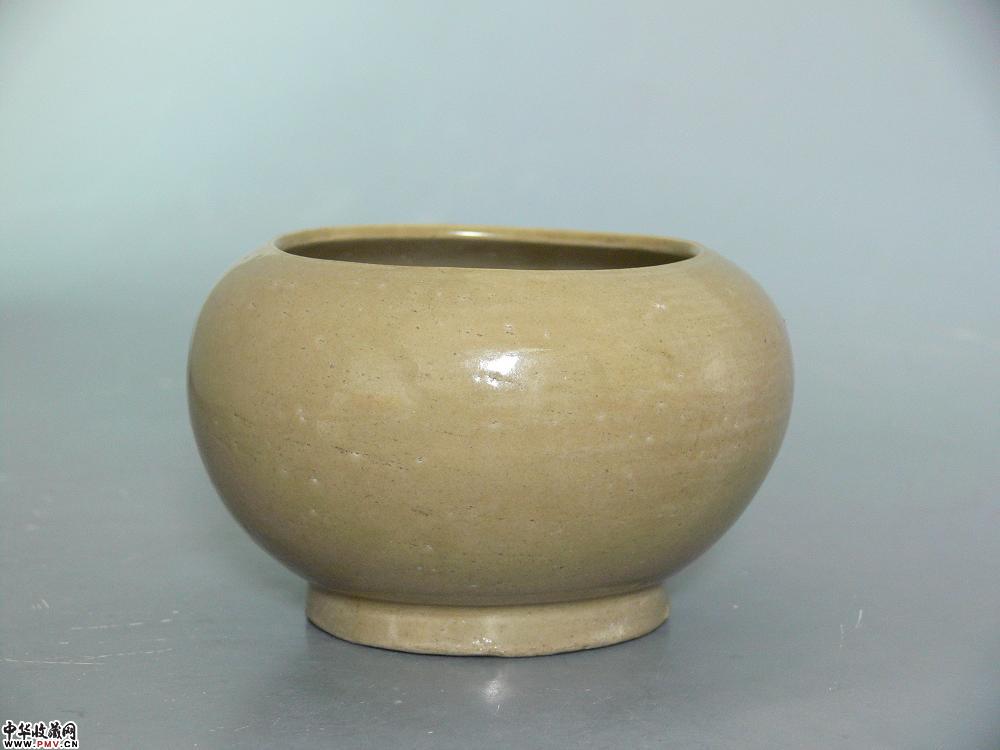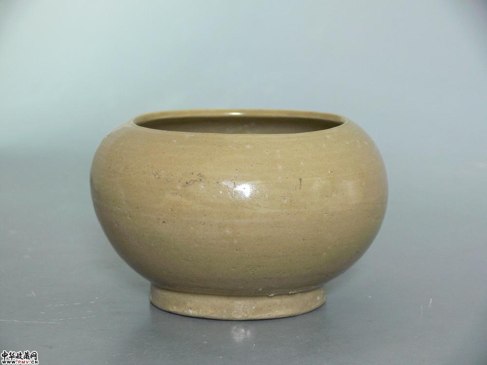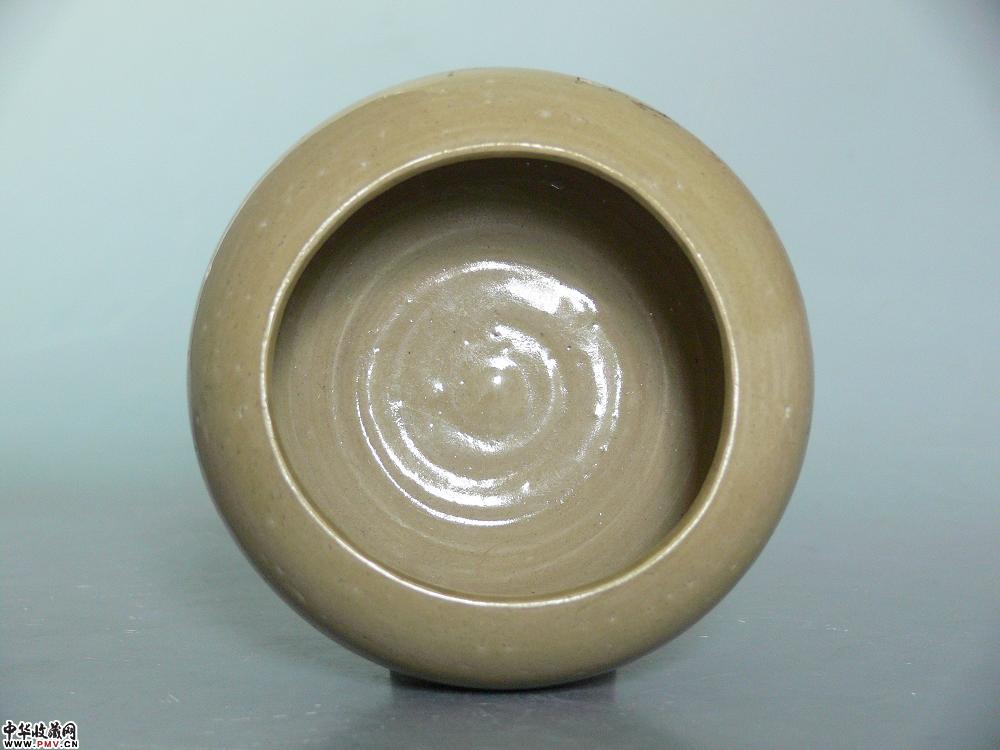 高7.8cm,口径9cm,底径7.5cm。束口,圆鼓腹,圈足,施青釉,釉色泛黄,釉层薄而坚致,为北宋早期越窑器,仍沿袭五代越窑精品之传统,文房用具,口沿有疵及剥釉,已修复。