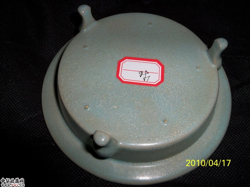 器高:4.5CM 口沿直径:14.7CM 底径11.2CM 整器折沿唇口,三简化兽足,仿商周青铜器造型,器型规整,因胎薄烧造时稍有变形。整器釉色天青,肥厚莹润,内外施满釉,釉面布满细小蝉翼蚊片,釉面有隐约可见鱼子纹,少许鬃眼,内外釉面有些许牙白色自然水沁痕,折角处因釉稍薄微显羊肝色稍泛红晕,器底有五枚芝麻状不规则细小支钉,从支钉断面可见香灰胎色。整器手感偏轻,釉色在不同亮暗光线下稍有变化。全品相,800万RMB.