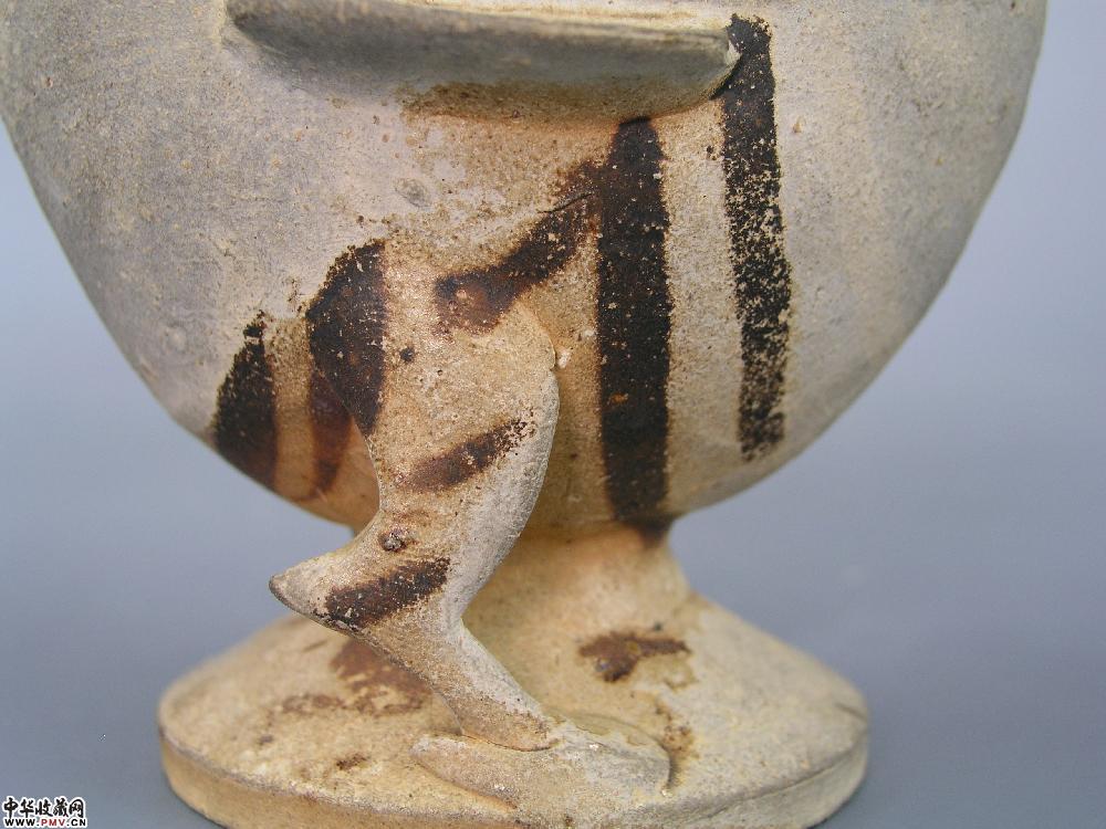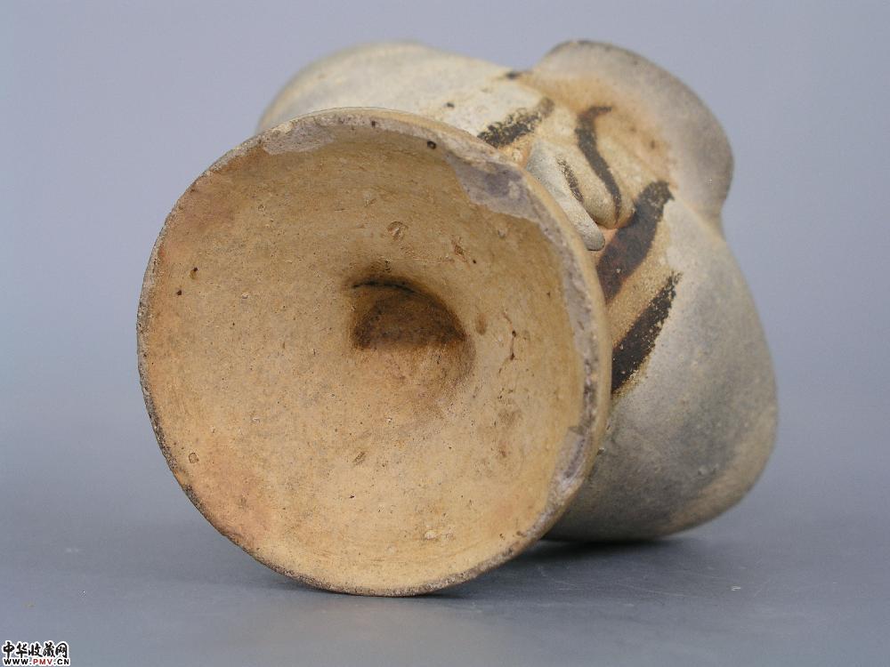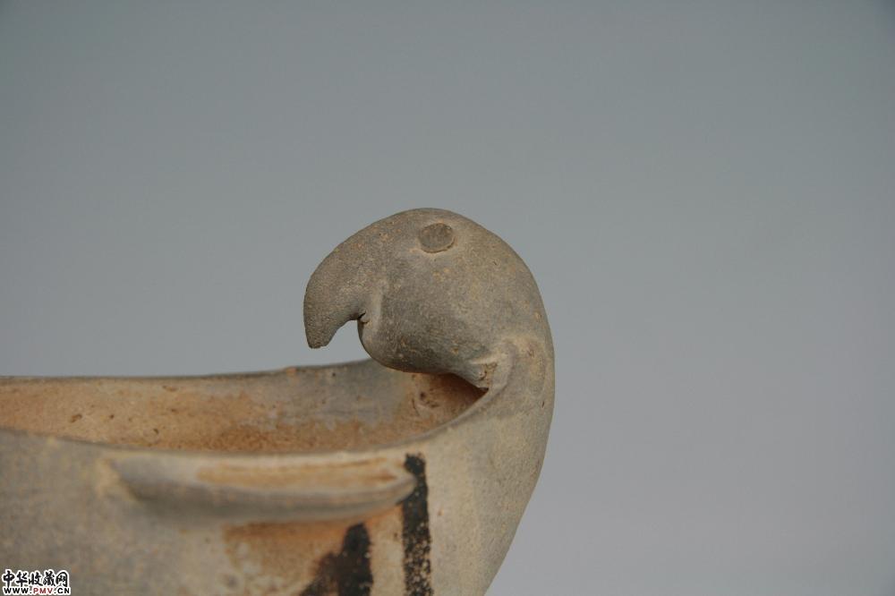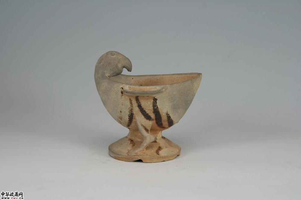 器形为一回头鸮,鸮身成杯状,下承以平面型垫板,鸮身有彩绘,部分脱落,为唐代长沙窑器物,完整传世,较为少见。