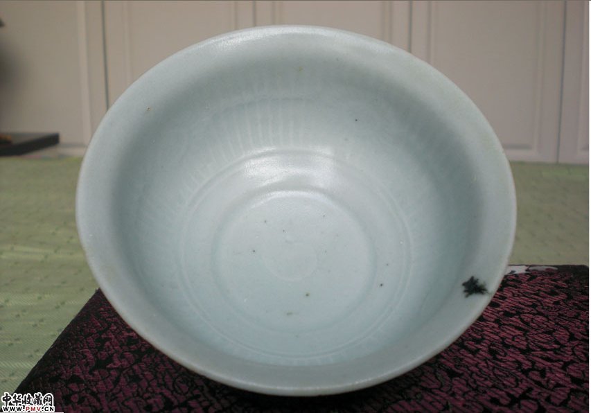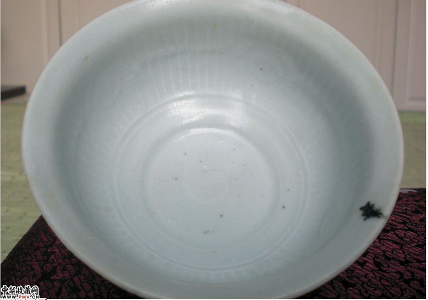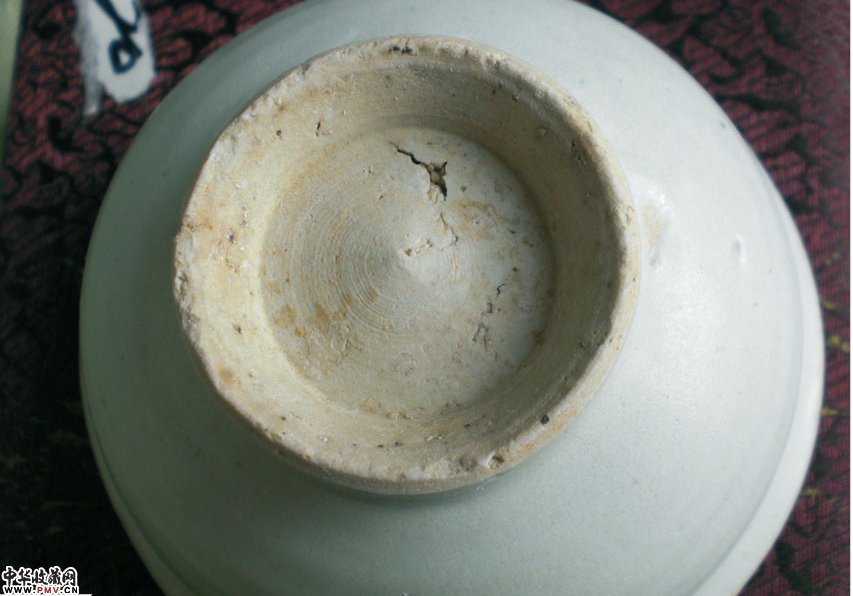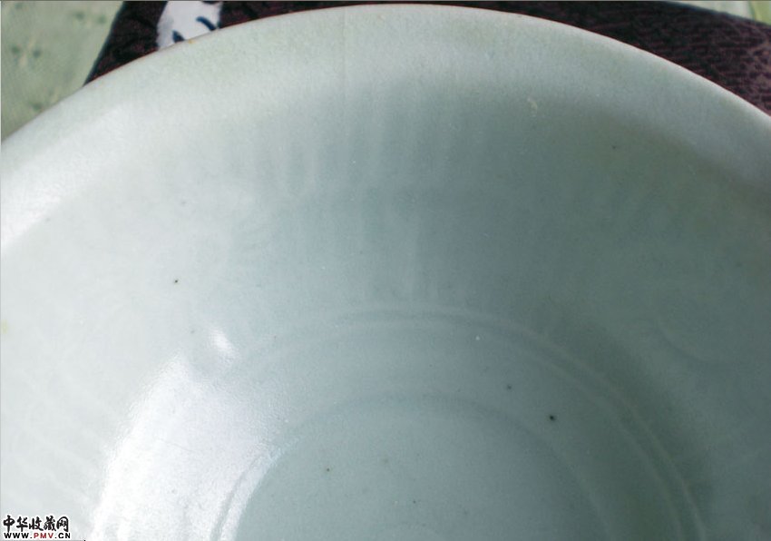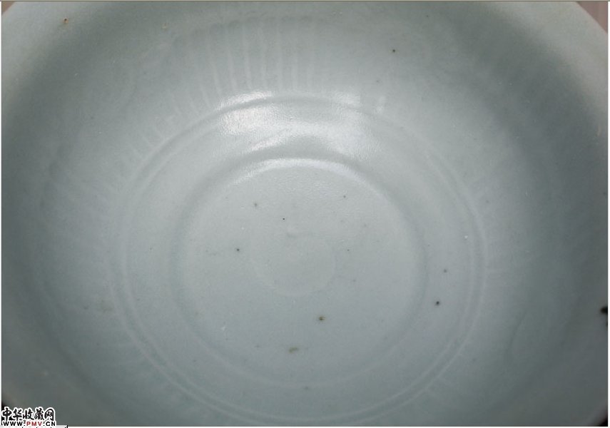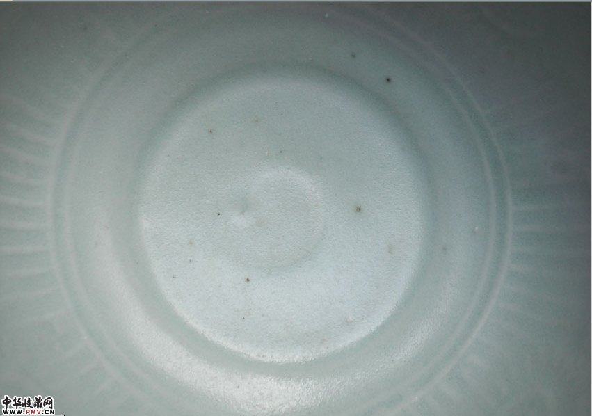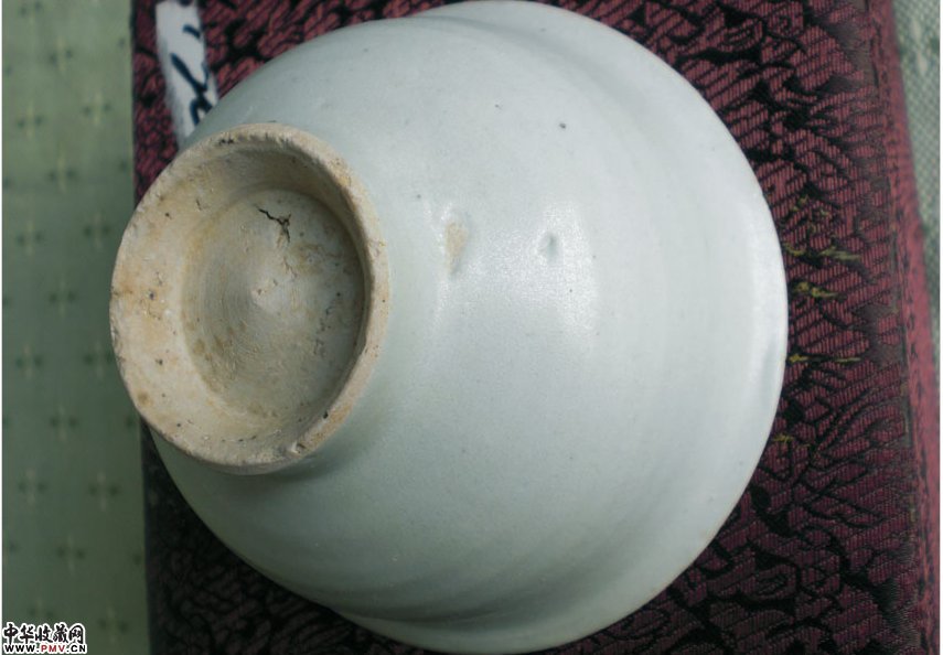 口径12.5厘米,高6.5厘米,口有一很不明显的暗线,第6图反映清楚,碗内印团菊纹,弦纹等。枢府瓷是元官府浮梁瓷局直接管辖下的瓷厂所生产,专为元官府定烧的日用器,釉层厚润失透如鹅蛋青,胎质细润呈灰白色。