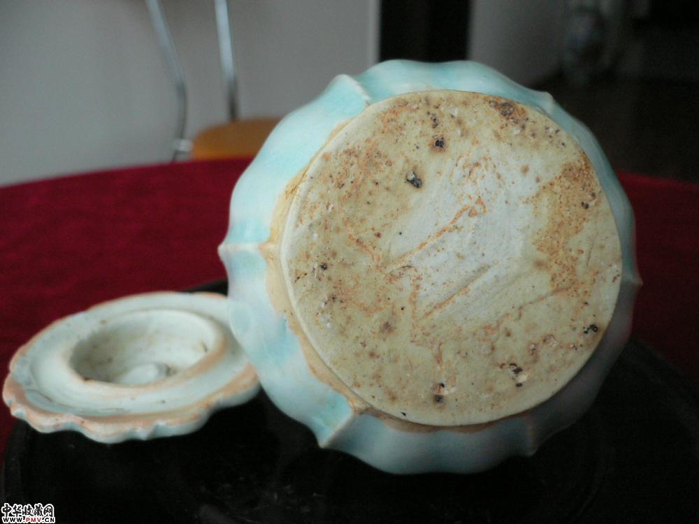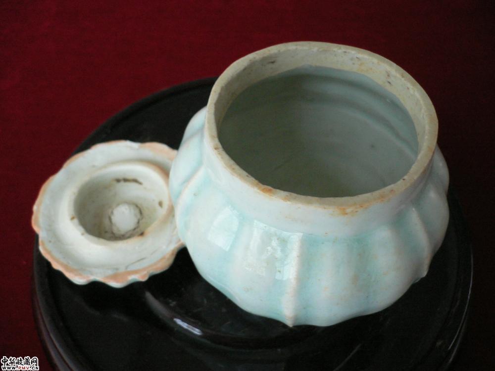 连盖高8.5cm,口5.2cm,底5cm,平口,直颈,圆饼足,圆腹呈六瓣瓜棱形,带印花六出花瓣式盖,釉水滋润晶莹,十分精巧雅致。属景德镇湖田窑典型瓷品。