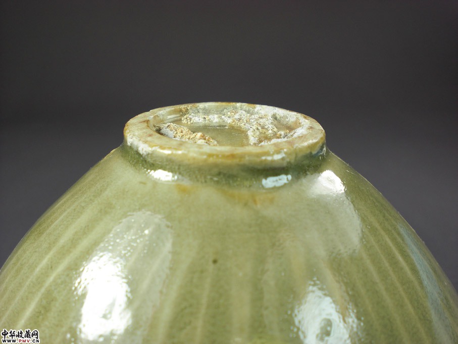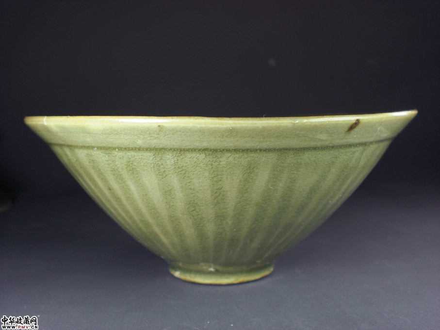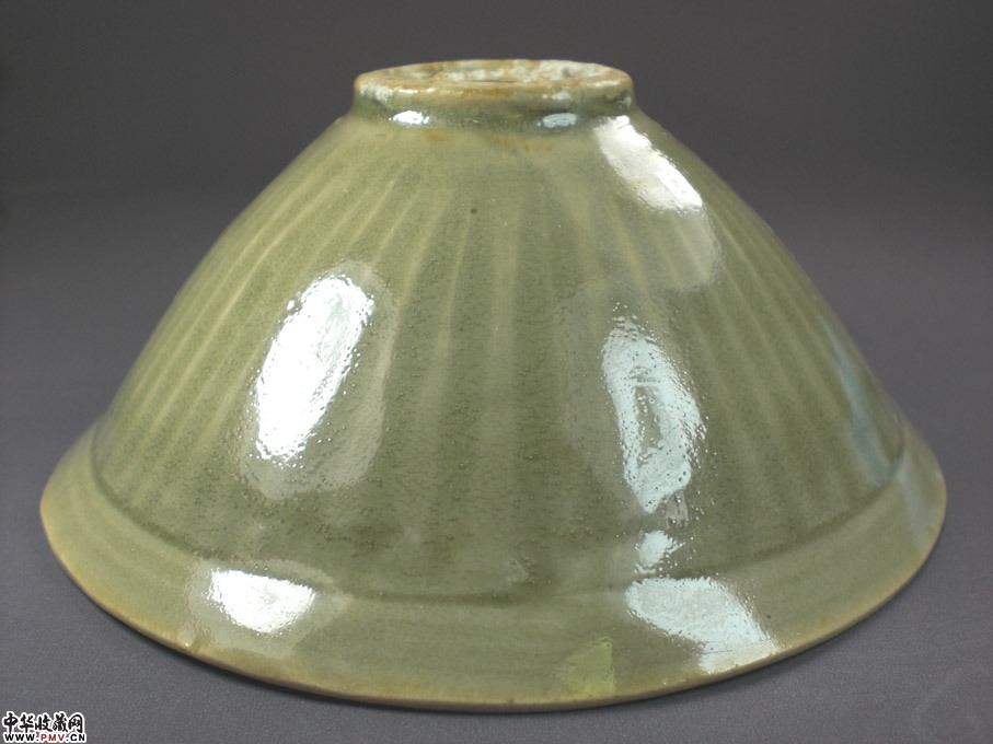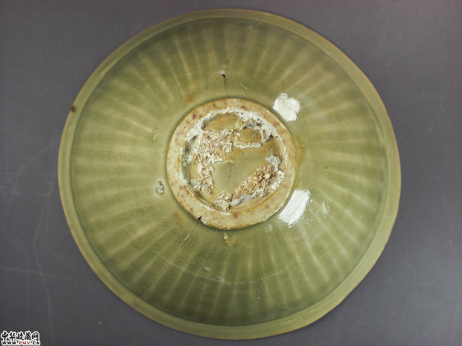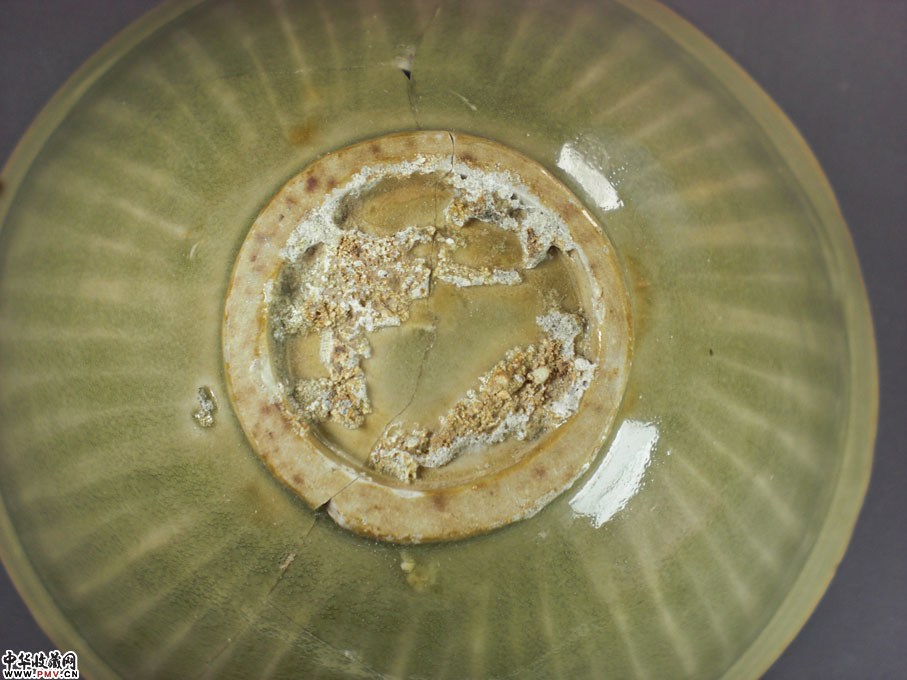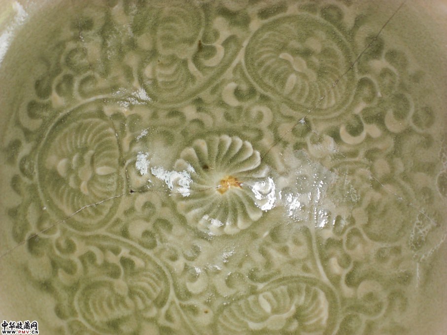 口径12.5厘米,可惜残粘,釉色一流,呈斗笠状,盏内印团菊花纹,外剔刻条形纹,不用多说,非常开门!