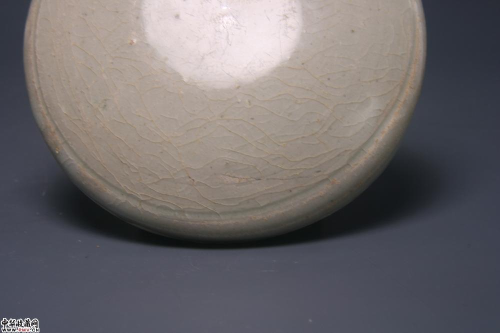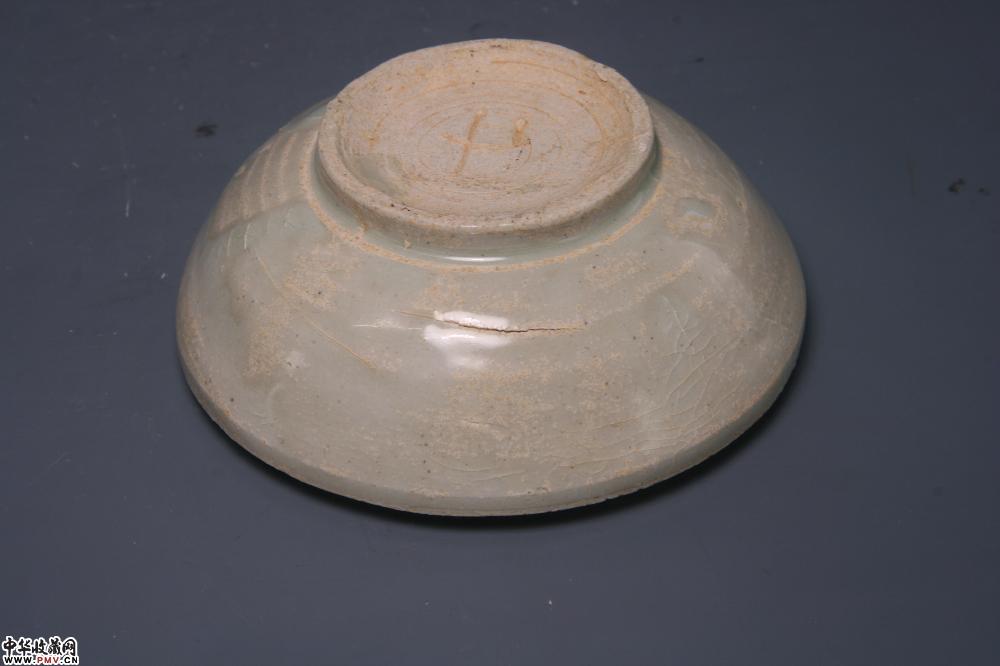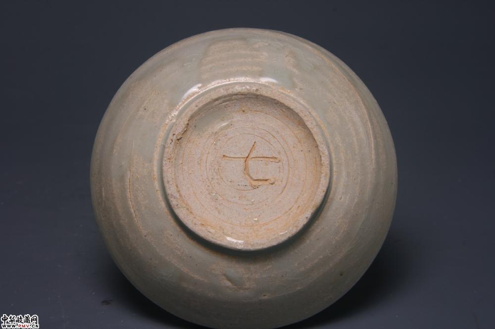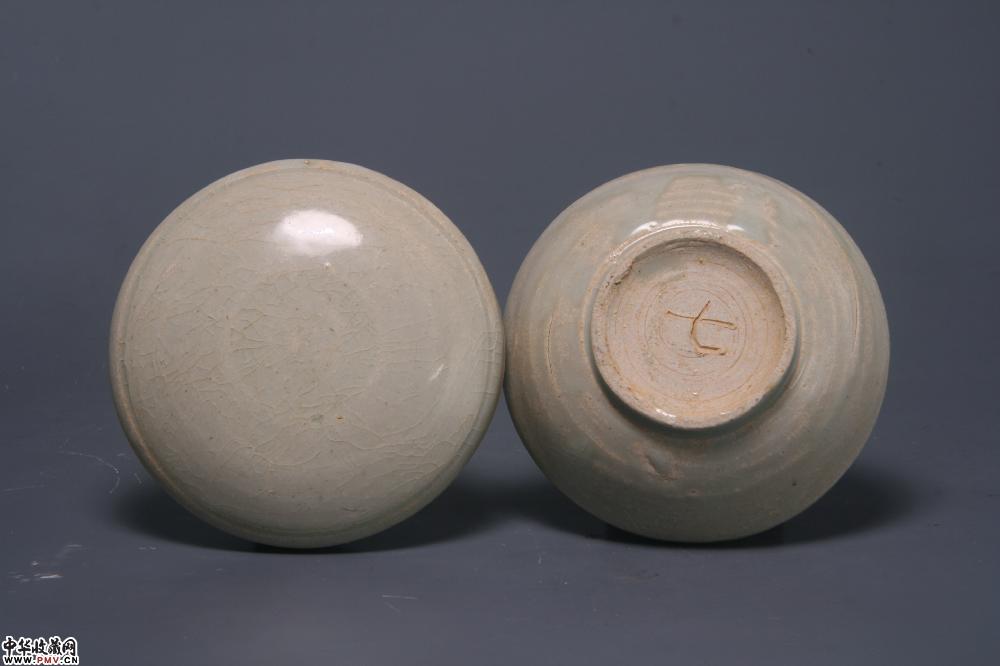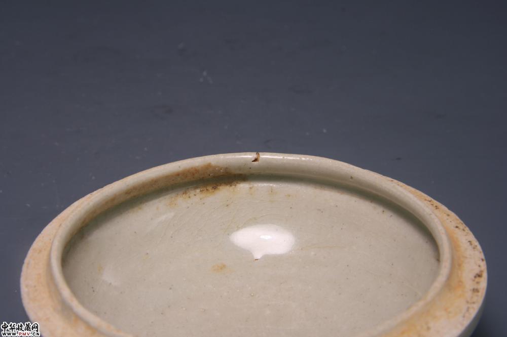 通高6cm,口径10.4cm,底径5.2cm,盒身外侧有两处窑裂(不透),盒沿已小窑伤。底刻“七”字。