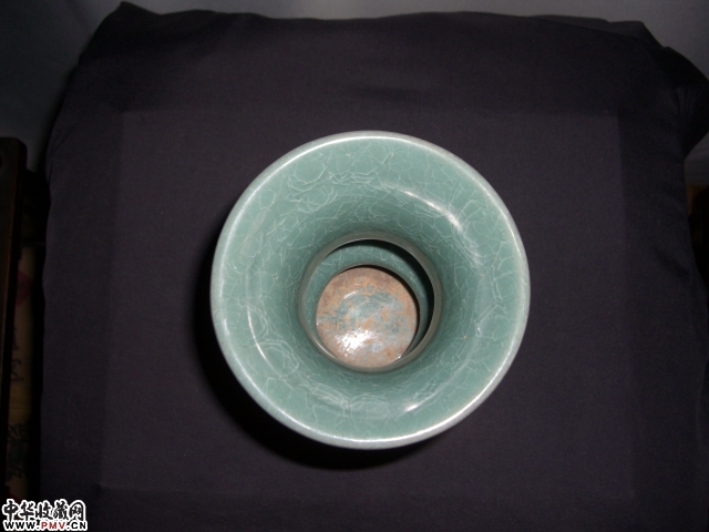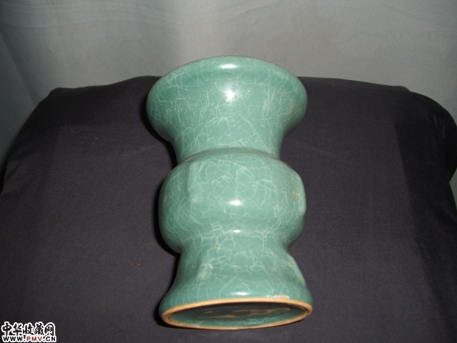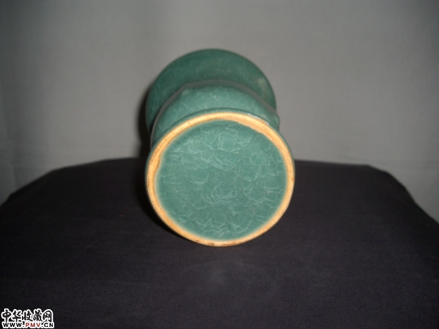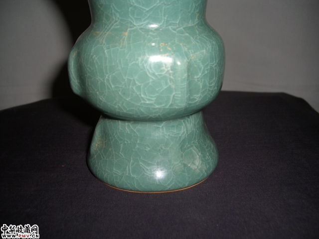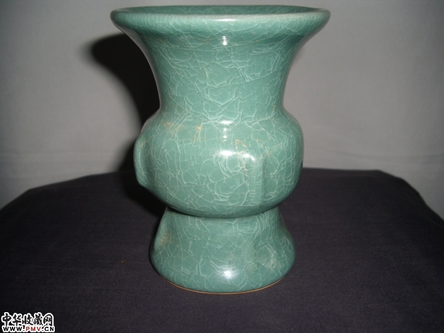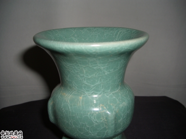 特征:侈口圈足出戟尊,胎白泛黄釉翠灰,层层叠叠冰裂纹,恰似银线描花卉......