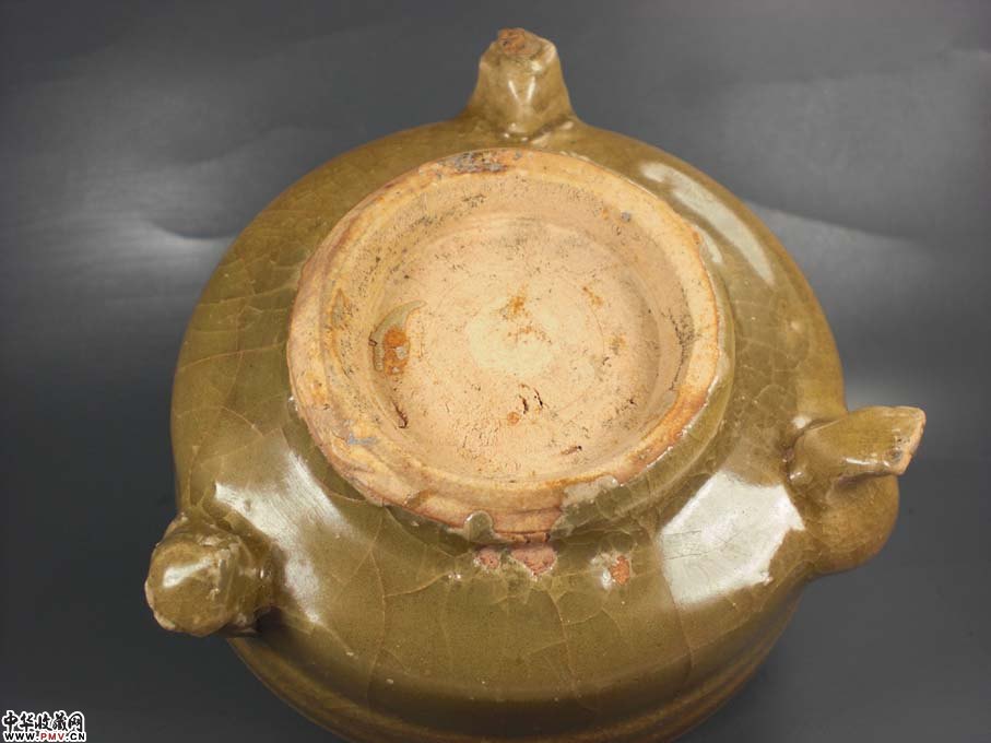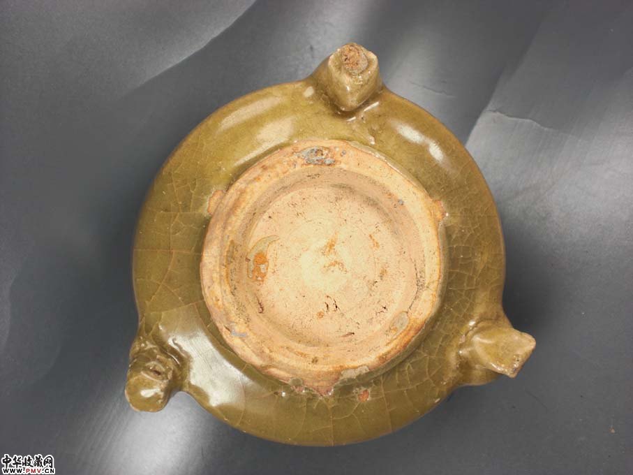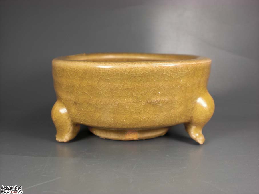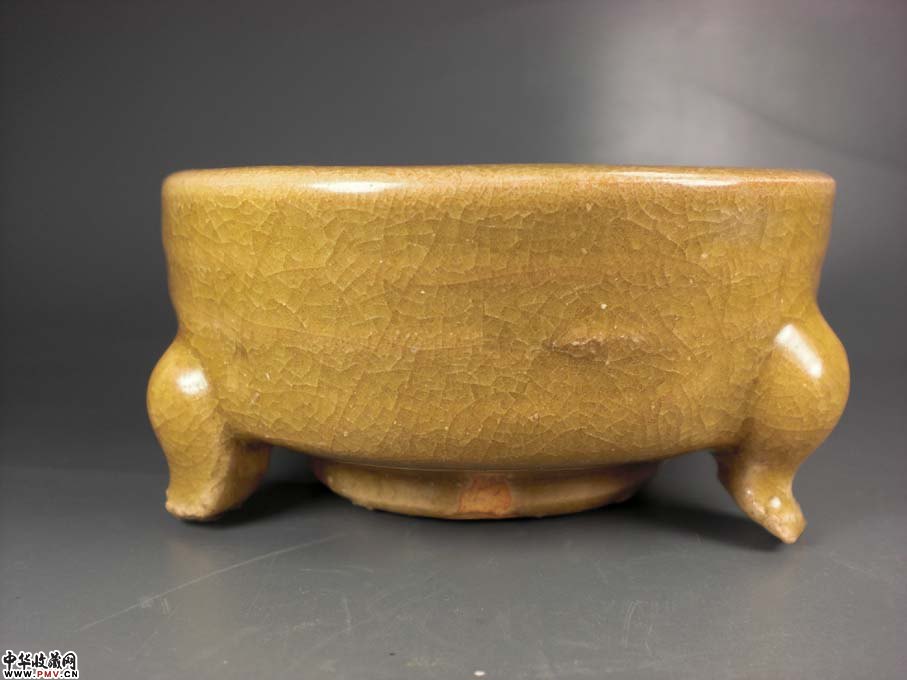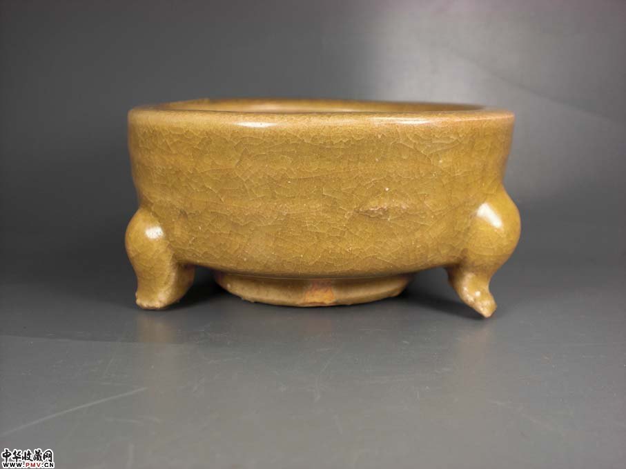 径8厘米 高4厘米,口沿有窑粘外完好!有官窑一样的开片,身上几道弦纹,三足悬空,给人以古代想象的空间,古朴典雅!
