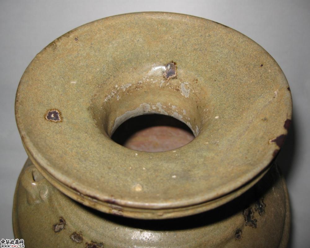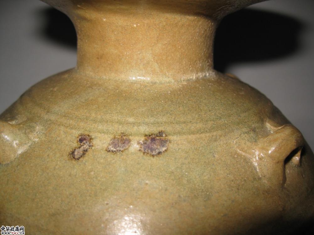 东晋越窑点褐彩四系盘口壶一只,釉色莹润,器形规整,局部点褐彩十分自然,与土沁一致,深入胎骨,手感重量适中,底部外侧有小爆如图,可以说全品相了,高17.5公分,口径12公分,最大腹径约16公分,底径11.5公分.