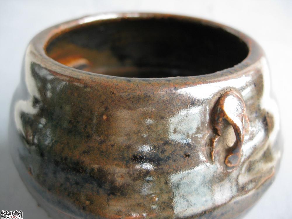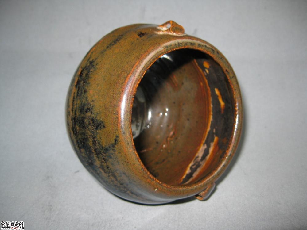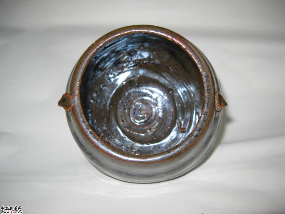 明代黑褐釉窑变双系罐一只,釉色莹润,黑釉与褐釉交相辉映,十分漂亮,器形古拙自然,双系,全品相,口径8.5公分,高8.5公分.