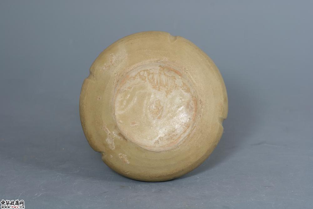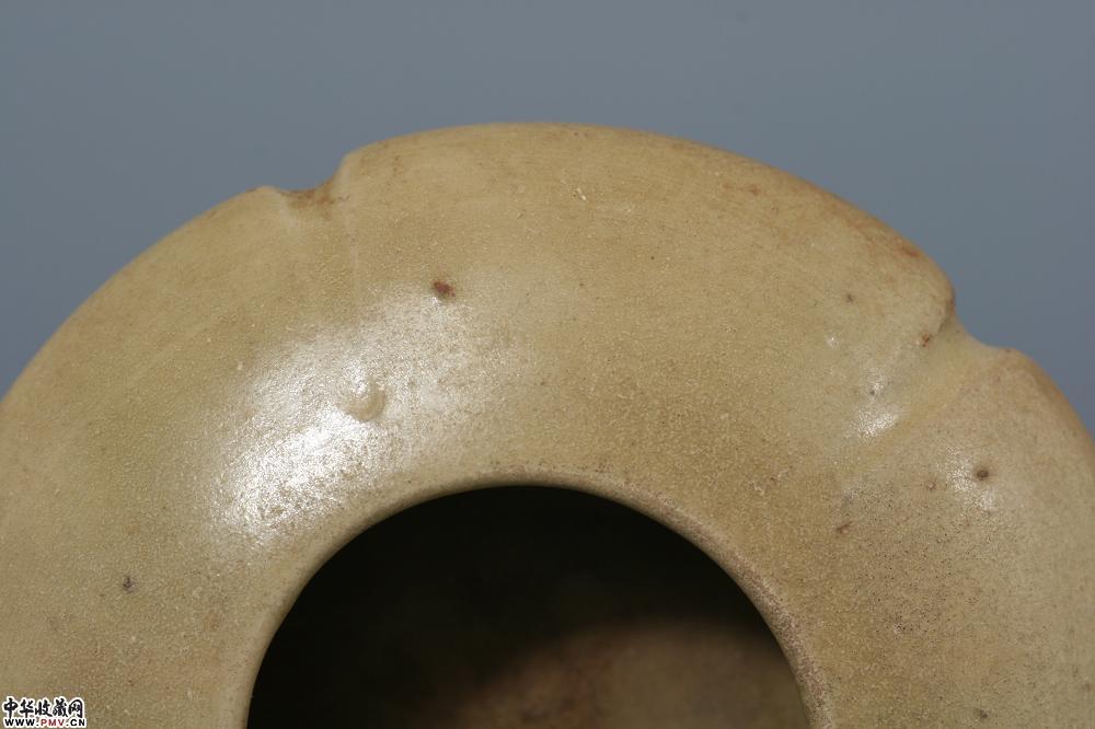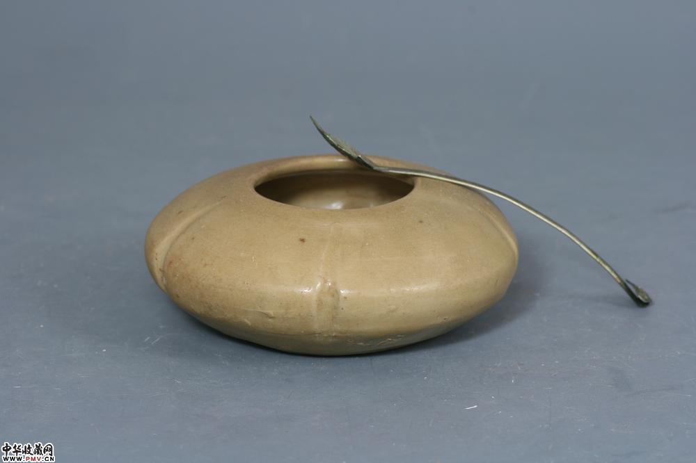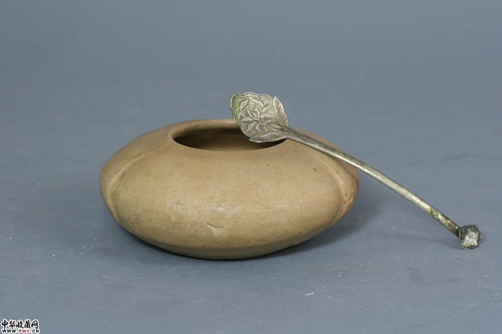 束口、扁平腹,平底,施青釉,釉面闪黄,釉层肥润,外腹带有四道竖向凹纹,是晚唐时期越窑产品。完整无损。中国的文房用具自魏晋时期开始出现专用器物,南北朝时瓷砚、瓷水盂等已经相当成熟并多样化。唐代越窑生产的青瓷文房用具代表了当时的最高水平,具有丰富的文化内涵。配清代银质水勺,勺头为莲花,勺尾为如意,取意妙笔生花,吉祥如意。