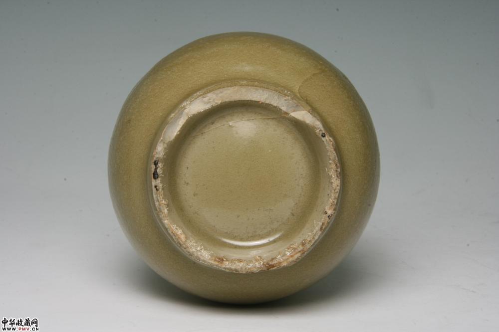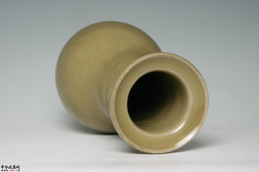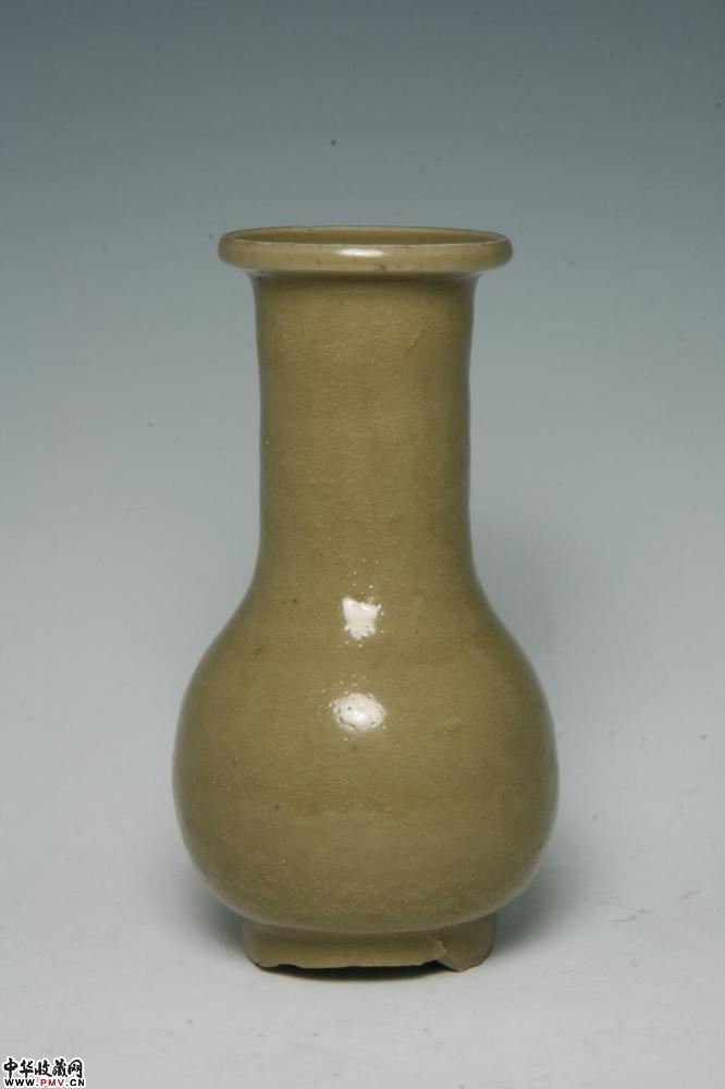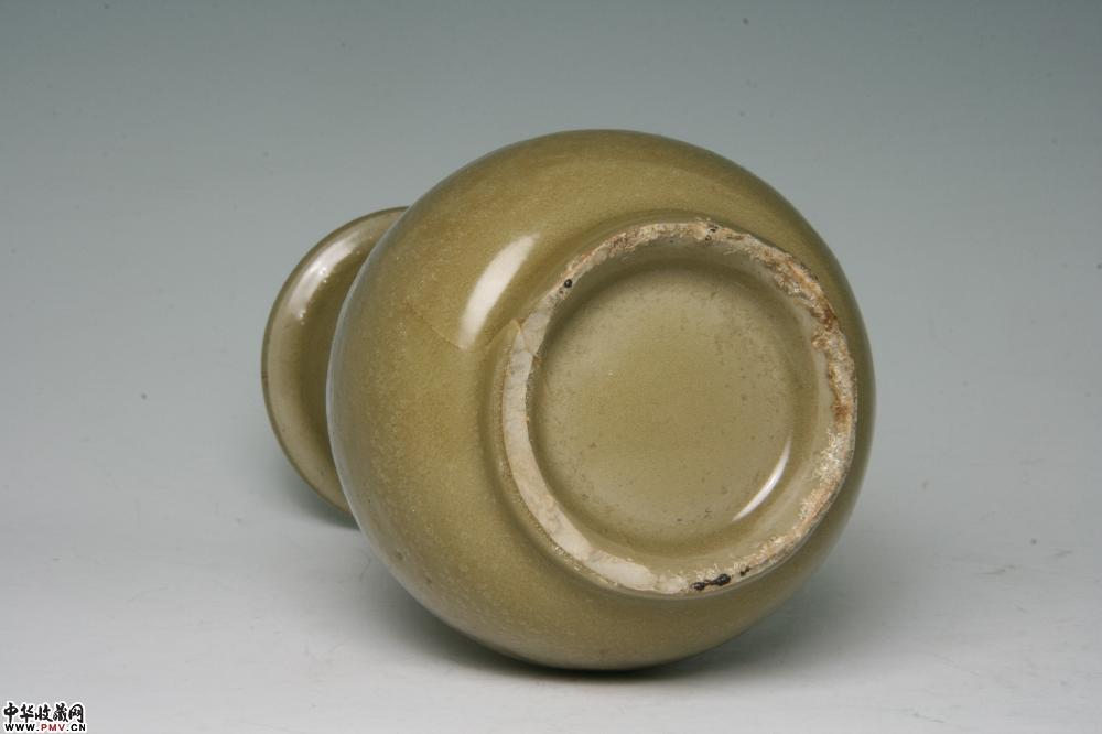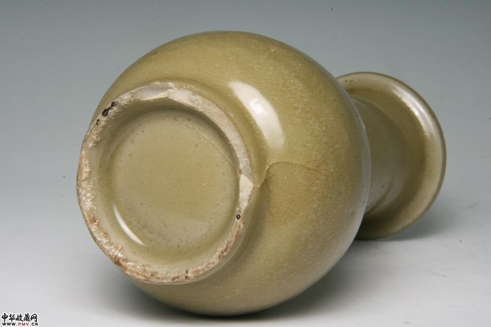 高16厘米,口径6.2厘米,底径5.3厘米,器形规整,釉水肥润,呈金黄的蜜蜡黄,比普遍的梅子青色更稀少,作形古拙,是一件难得的宋代艺术品,足沿嘣炸,不影响整体的观感。