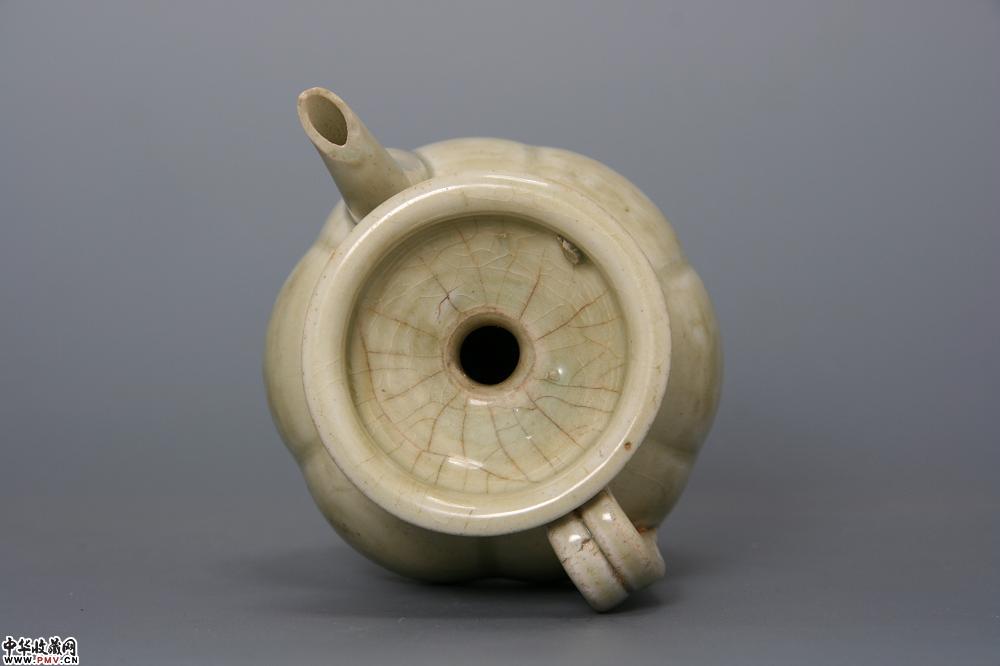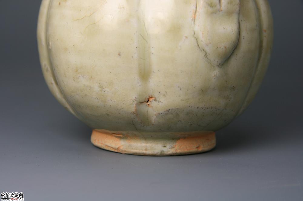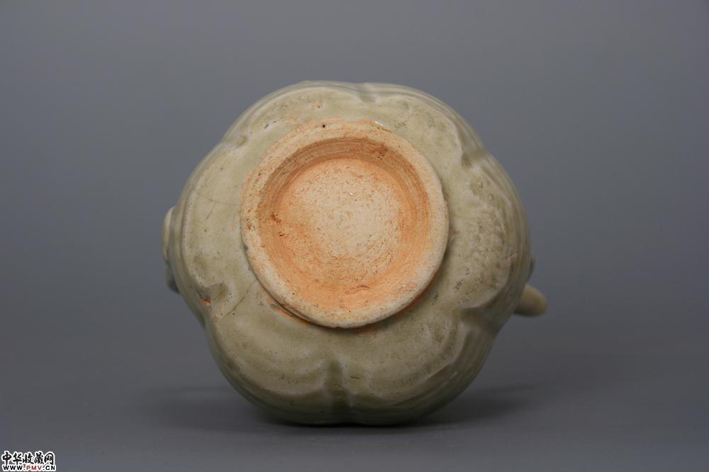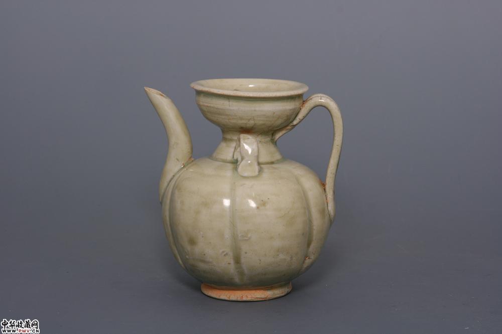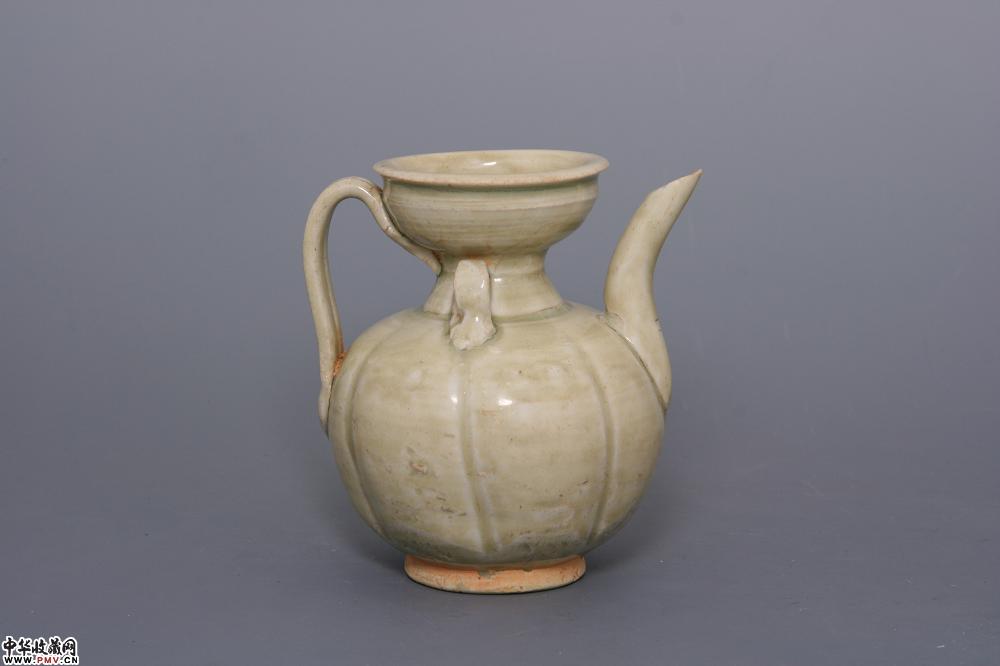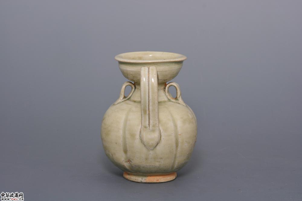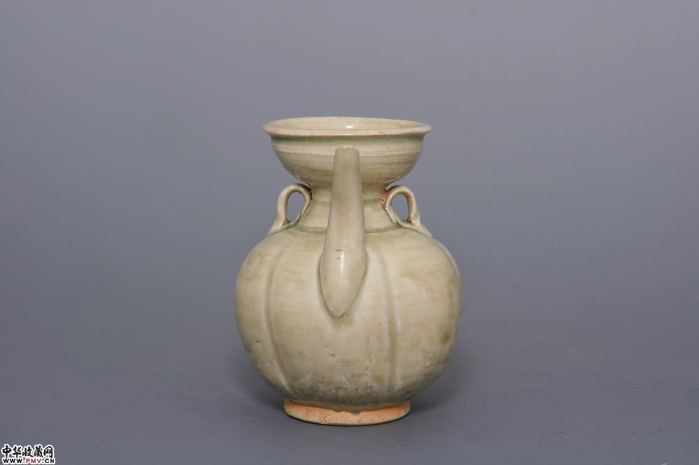 五代景德镇窑青白釉双系瓜楞盘口执壶