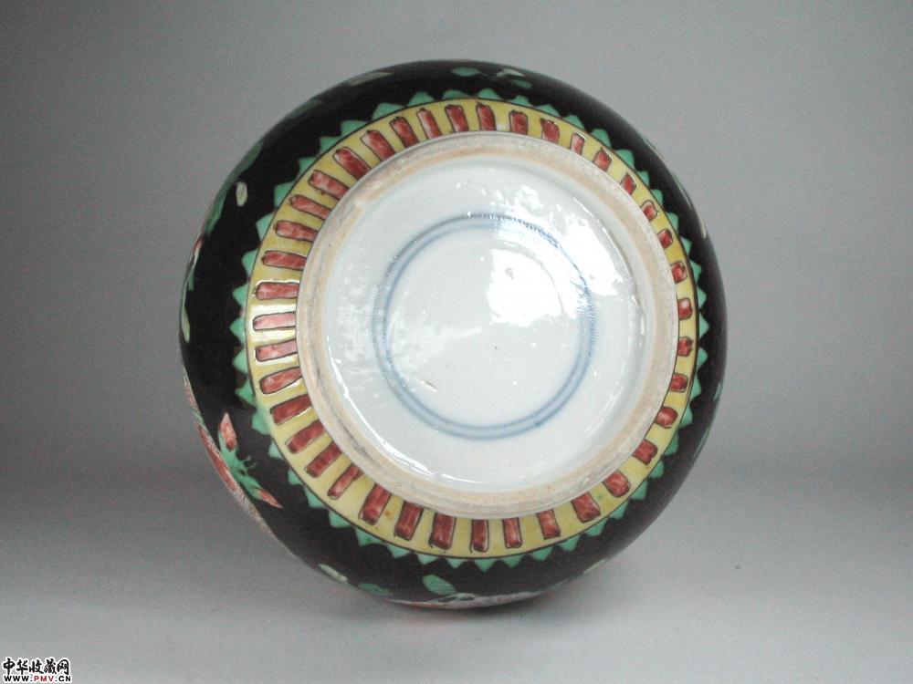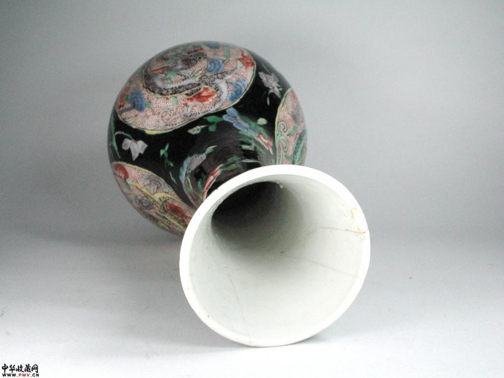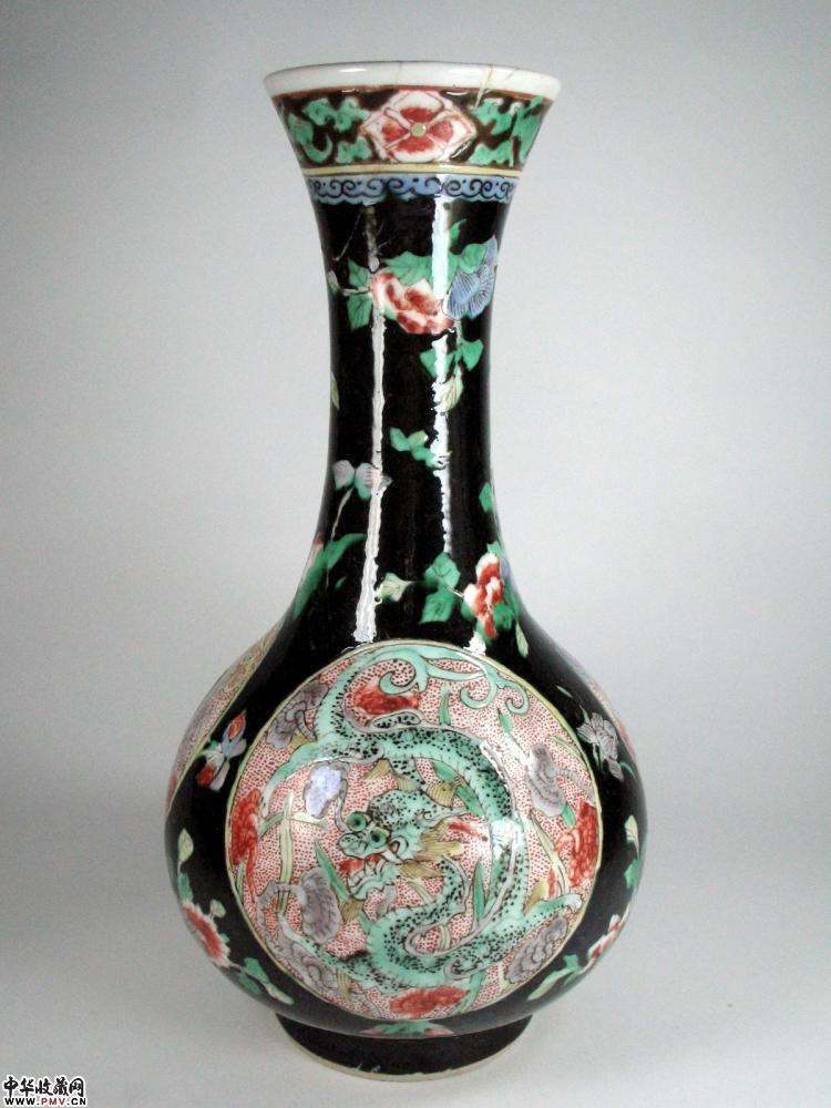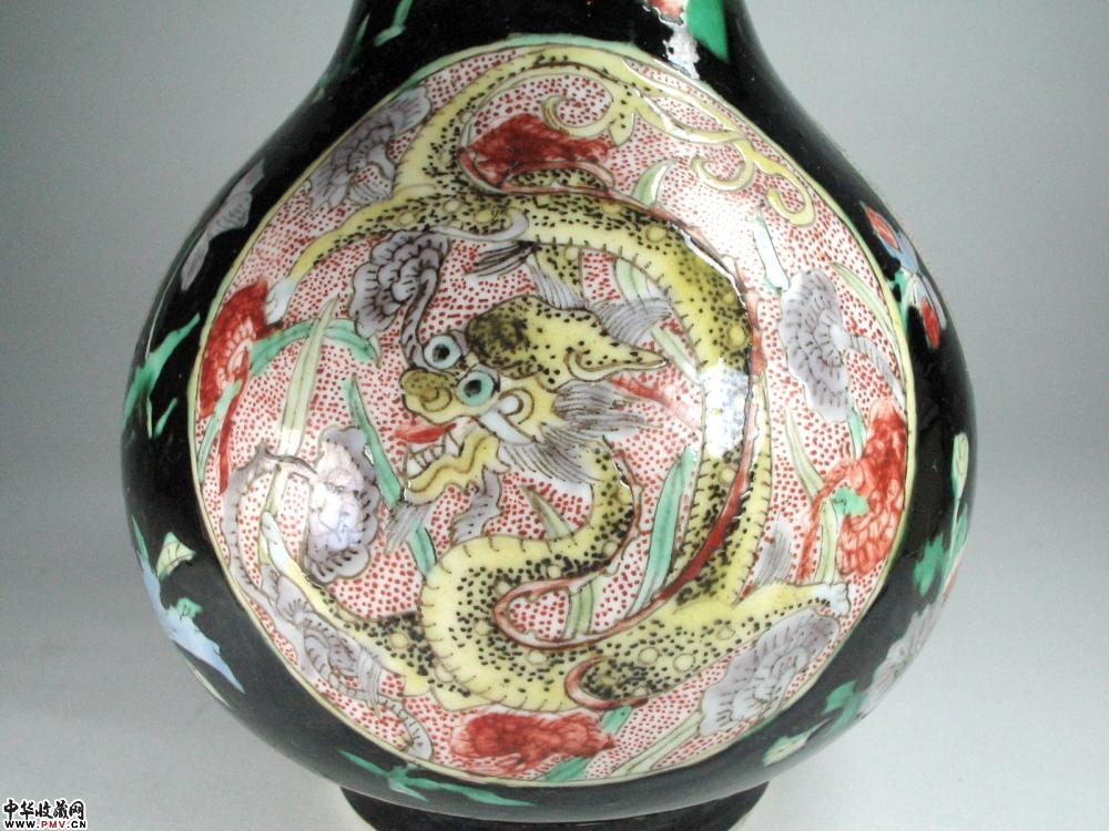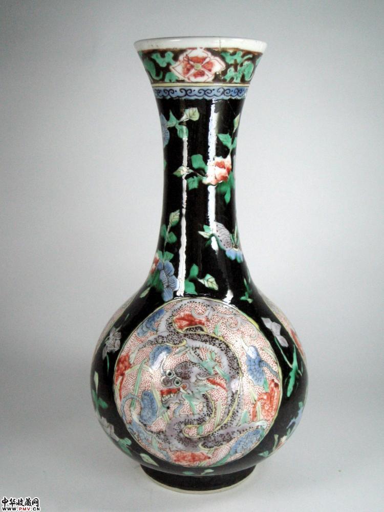 清代墨地五彩开光团龙纹纹瓶
