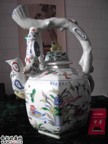 明 宣德斗彩鸳鸯戏水花卉提梁大壶