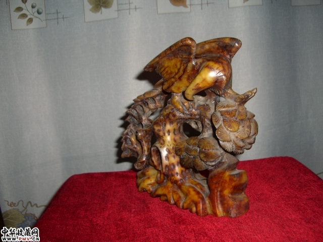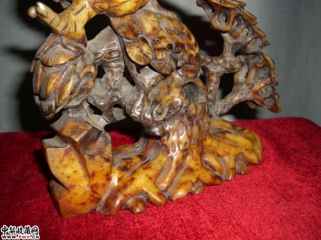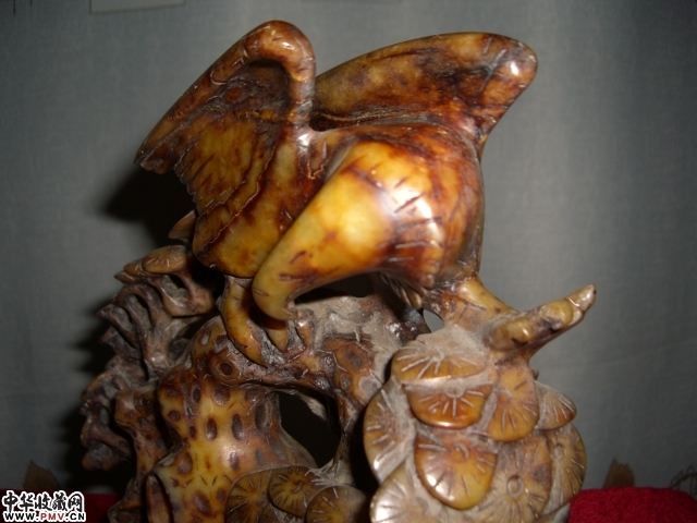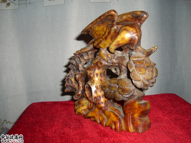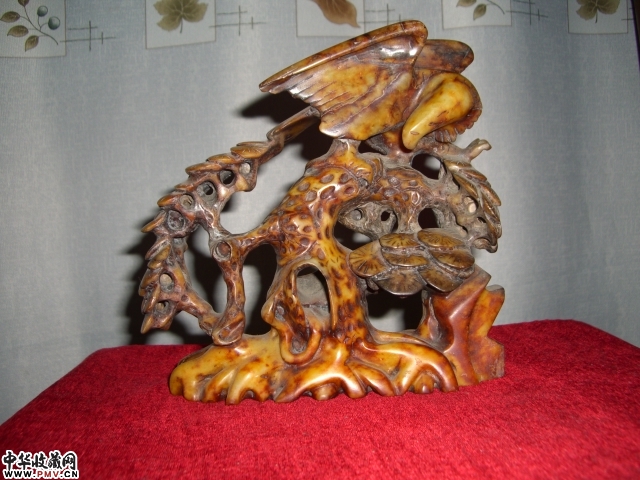 特征:石质温潤细腻,半透明,黄红褐色间杂,似豹皮。雕工精致,古松叶茂盘根挺劲,鹰立冠枝,展翅欲猎,形象生动;颇具艺术魅力。