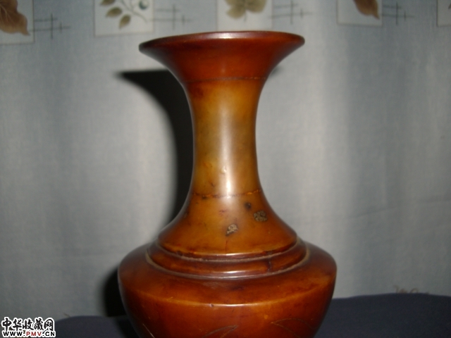 特征:质细润,色黄,透明,撇口,长颈,扁圆腹,圈足。腹部嵌泥金莲花纹。琢工精致,美观古雅。为储香摆件。