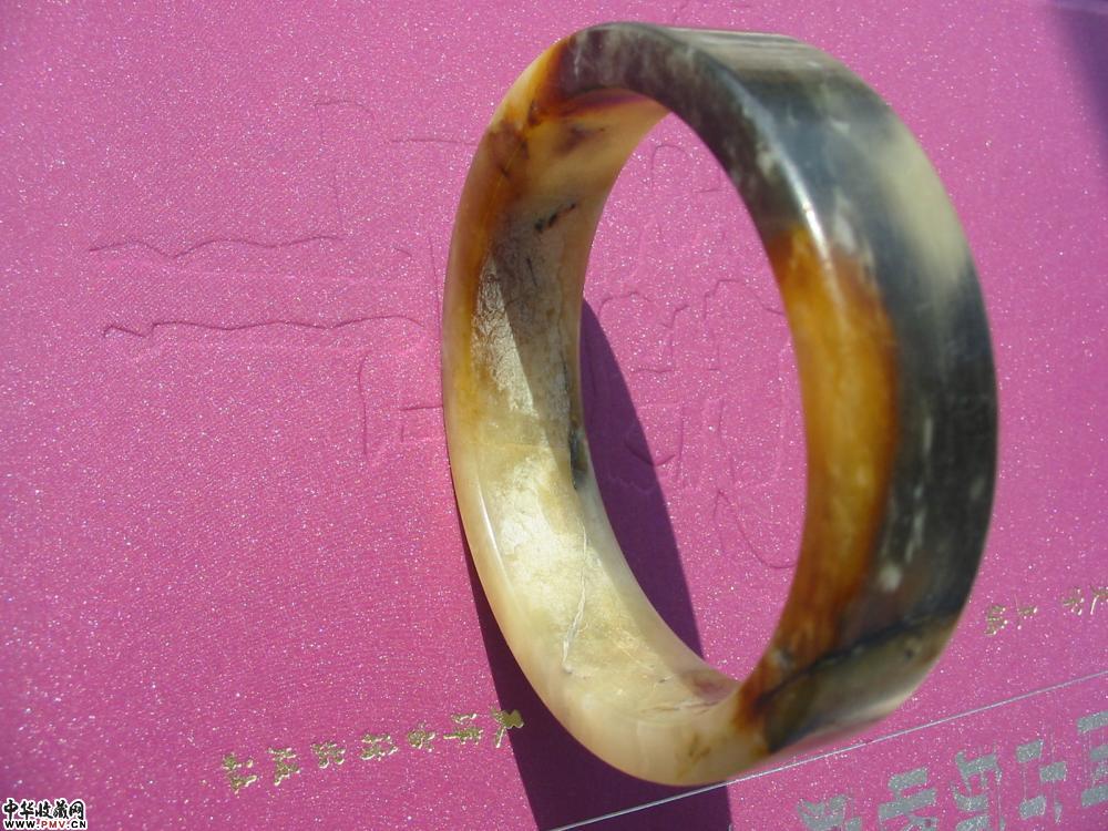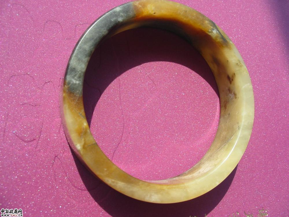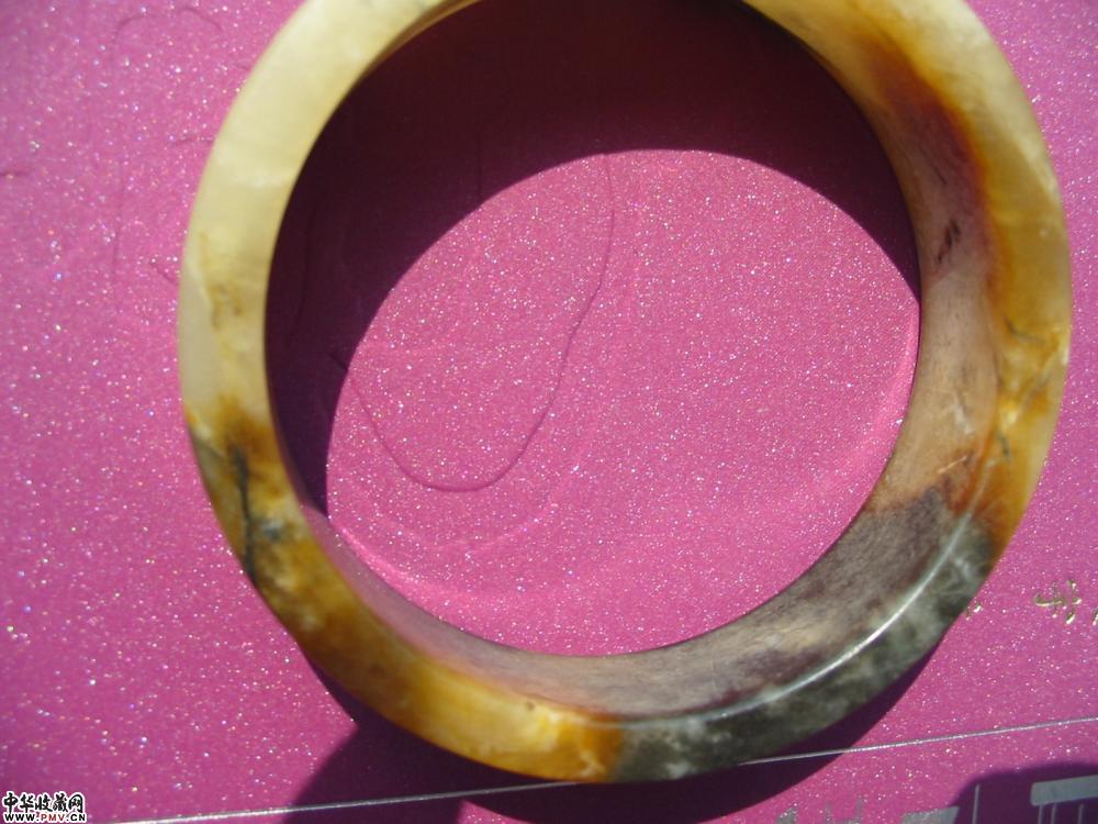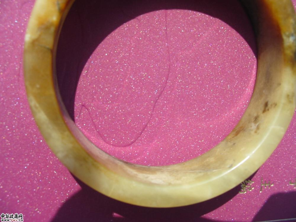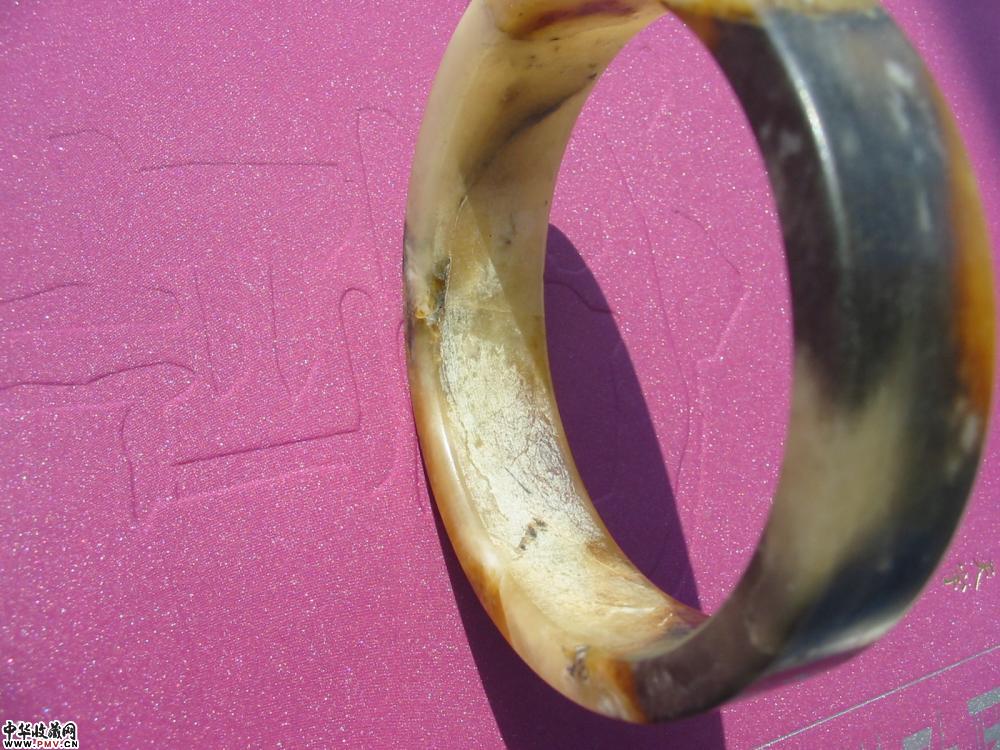 玉环受沁后局部呈暗灰色、暗黄色、白色,内外壁表面光亮、滑润, 玉质呈半透明状,内壁包浆滋润,年代特征开门,存世少见.
