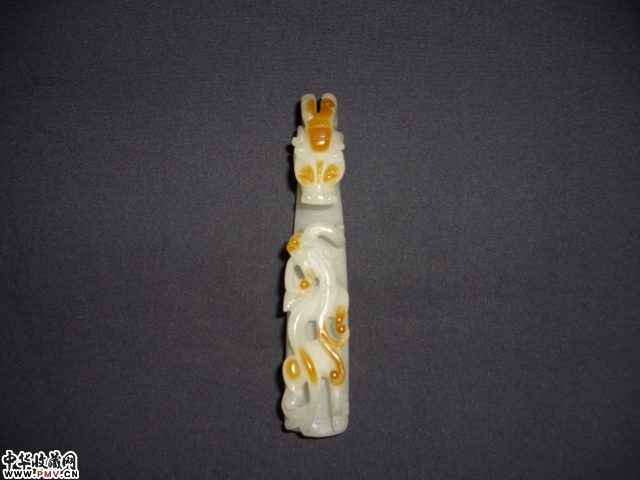 特征:和田青白籽玉,油脂光泽。雕龙首螭子,苍龙教子,寓望子成龙之意。按皮色巧雕留金,飾角点睛,别具一格。珍美。