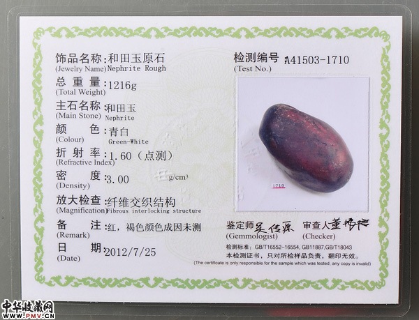 注:重1216g。开窗可见肉白,具有很高的收藏及加工价值。表面加色。带中华全国工商联珠宝业商会珠宝检测研究中心宝玉石鉴定证书。
