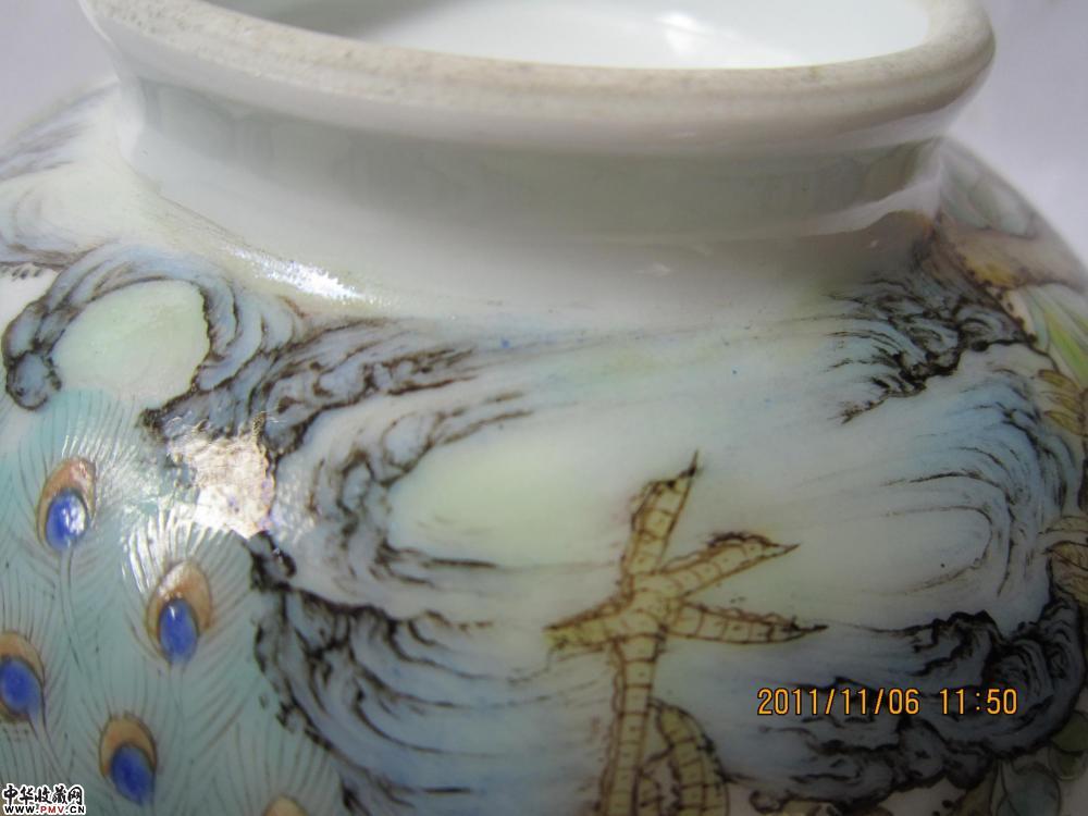 藏品介绍:口径14.8厘米,底径6.2厘米,高8厘米。直沿口,弧腹圈足呈滚圆状,碗形周正。胎体轻薄,通体施白釉,釉如白玉般温润滑腻,外壁图案以珐琅彩绘一雄一雌两只孔雀栖于岩石之上深情对望,互表爱意。左侧黄鹂鸟盘旋于石榴花枝头欢快嬉戏,遥望对唱。右侧两只蓝雀则栖息在桃花树上恬静遐想。所有景象绘画精细,栩栩如生,立体感极强!尤其体现在孔雀尾,先用金彩勾勒孔雀之羽翼,内填饰蓝彩,间以松绿彩绘羽毛,一丝不苟,惟妙惟肖。花卉衬以黄、粉,绿三色装饰,嫩绿色填竹叶,整体色彩搭配得当,雅致清新。最为有趣的是桃花纹从碗外延伸至碗内显得特色十足,衔接完美, 锦上添花!这种精湛的技艺就是雍正一朝最富盛名,最为流行,烧制难度最大,艺术境界最高的过枝绘法。也称【过墙绘画】。最后配以两句改编唐代诗人武元衡的“動揺金翠尾,飛舞玉池陰”完美地相结合,形成了诗书画印章于一体的工笔花鸟画。 此碗底足胎白细腻,滚圆光滑,俗称泥鳅背,底部落标准的“雍正年制”蓝色料彩方章款。综合以上我们不难看出,此碗图案所反映出雍正皇朝鼎盛时期的那种繁华似锦,国泰民安的富足生活。就连大自然的鸟类都显得如此勃勃生机,和谐共处的美好情景!藏品来历:康熙、雍正、乾隆朝珐琅彩瓷器历史档案资料 (根据清内务府造办处 各作成做活计档 及大臣奏折。) 雍正十二年二月初八日:首领太监萨木哈持来磁胎画珐琅孔雀碗一对,传旨:此碗花样画的甚好,著照样再画几对。钦此。于五月初二日画得孔雀尾磁胎珐琅碗一对,呈进,讫。《珐琅作》参阅:《清宫中珐琅彩瓷特展》第54页,图16。