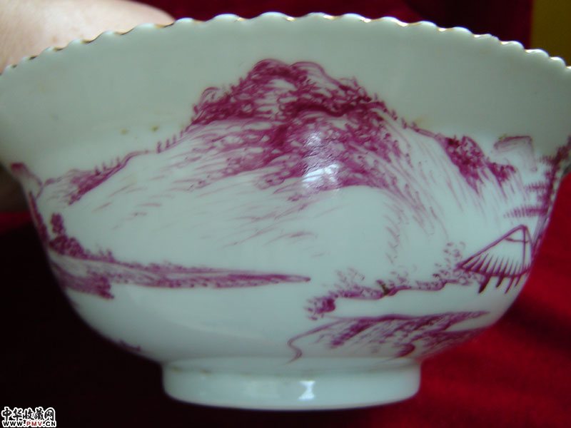 民国胭脂红山水人物花边碗一对