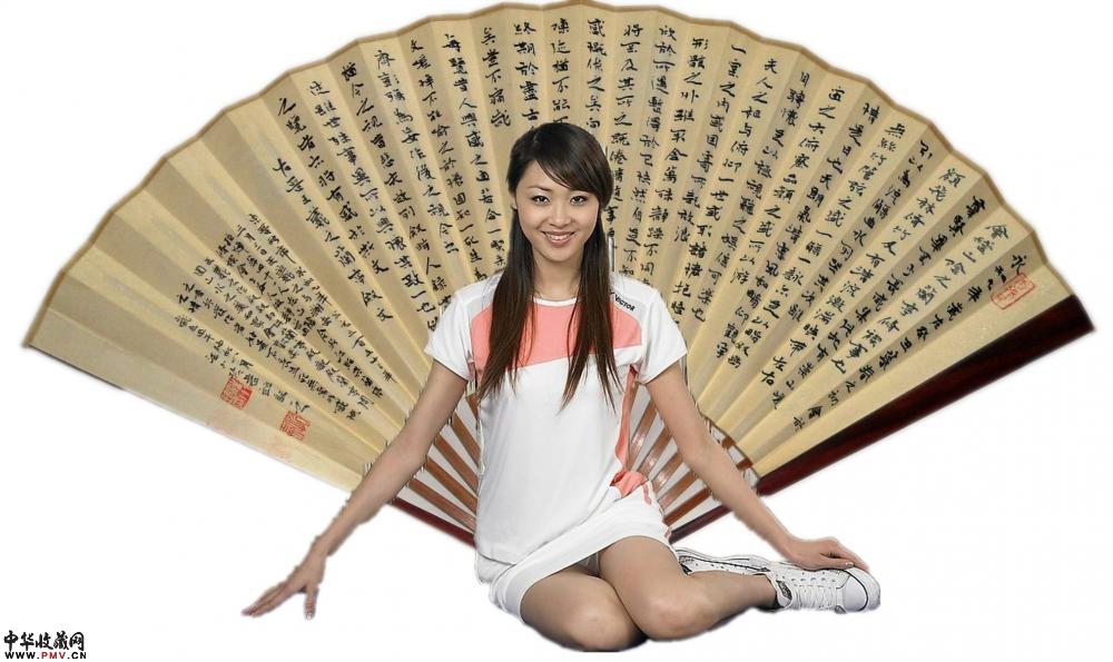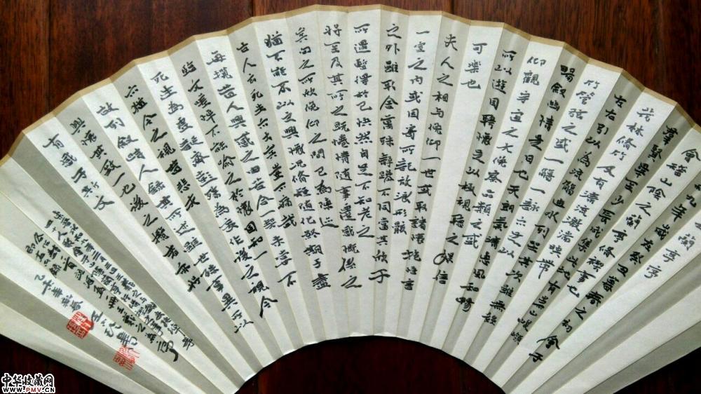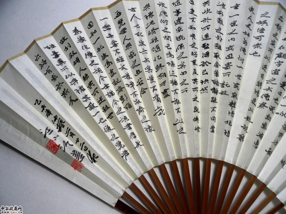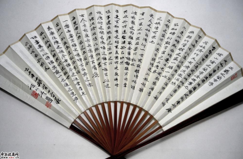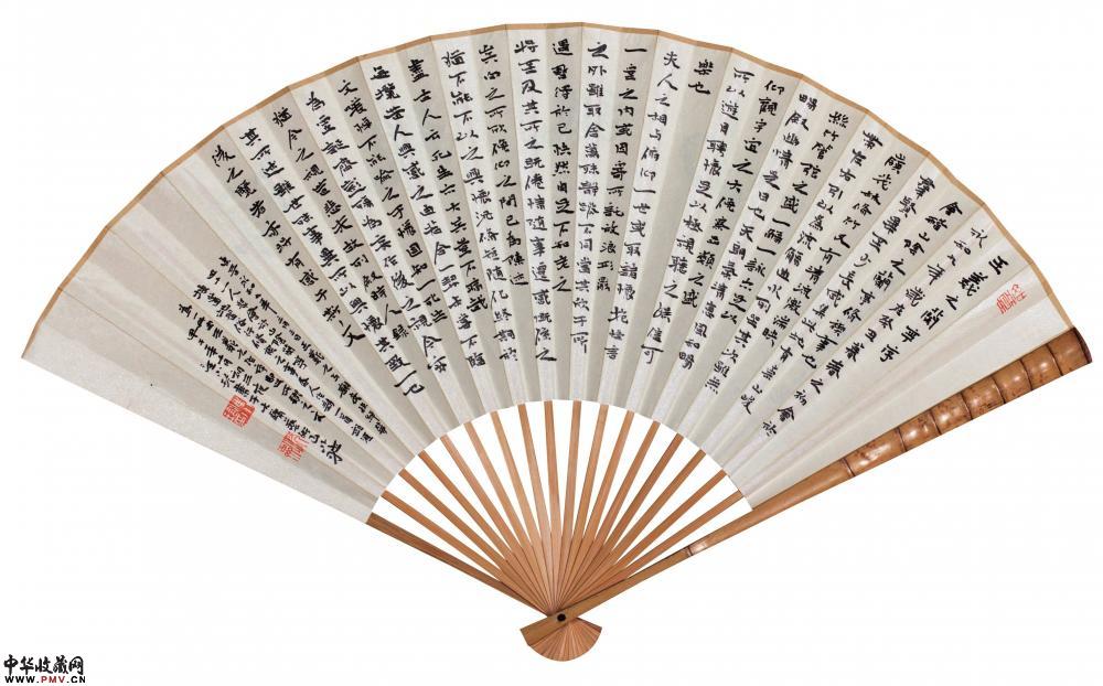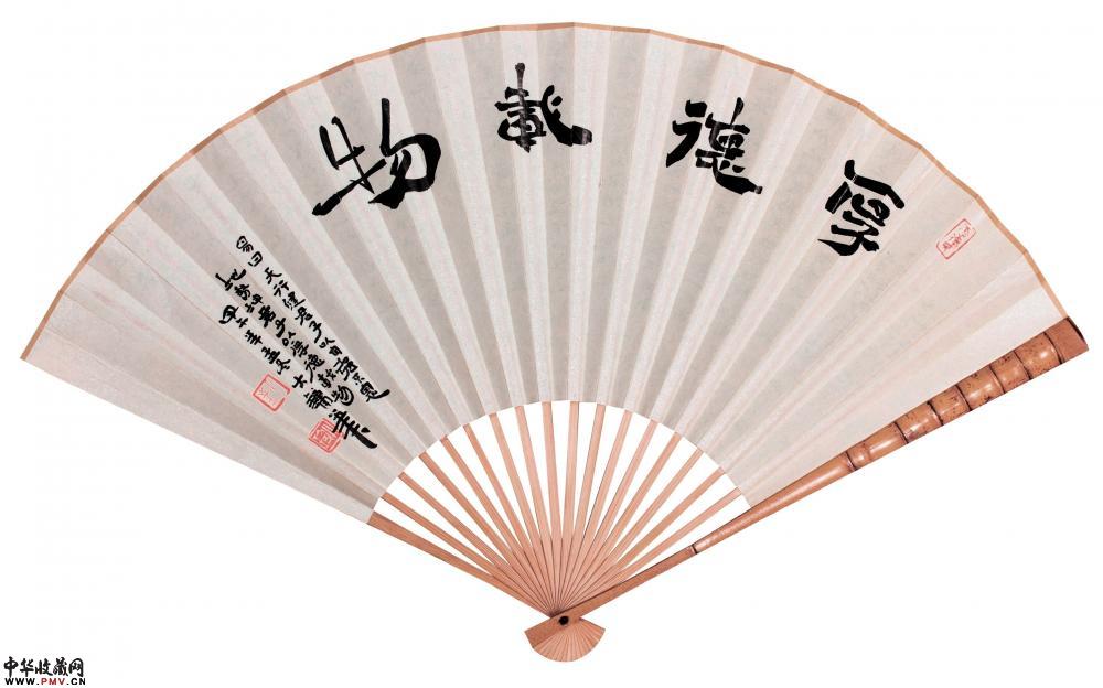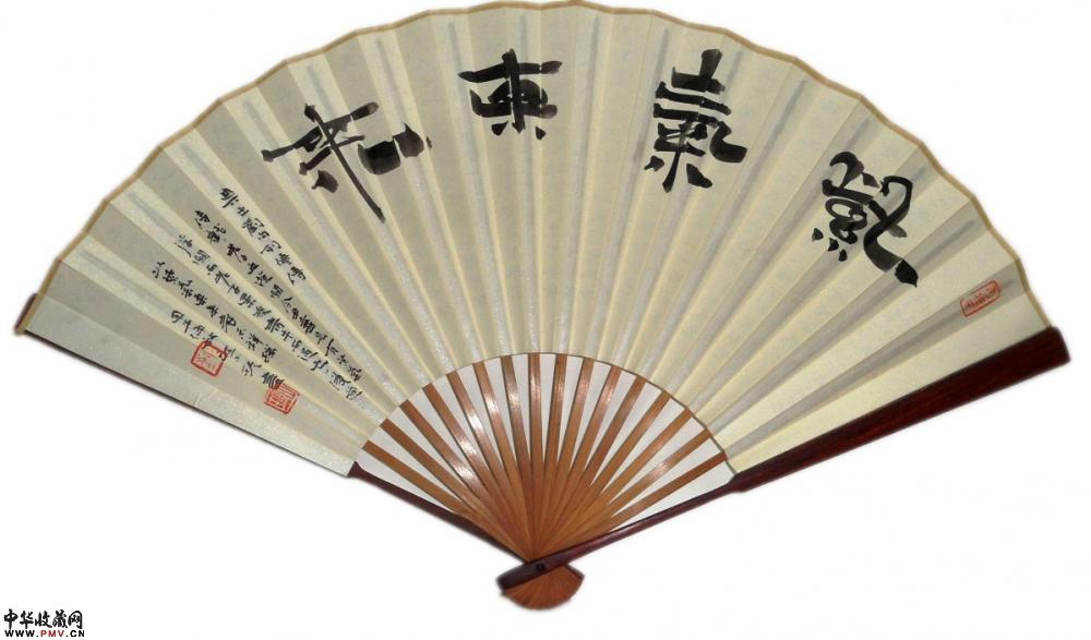 大镛书法礼品成扇●简介:成扇两面书写:一面小字(小楷或小隶书)满写,书写内容一般为《礼运大同篇》、或《陶渊明〈桃花源记〉》、《陶渊明〈归去来兮辞〉》、《王羲之〈兰亭序〉》等古文名篇;另一面大字(隶书、或楷书、行书)书写,内容为“厚德载物”、“紫气东来”、“于无声处听惊雷”、“超以象外得其环中”等吉言、名句;或以数枚精美印章组成精美画面。