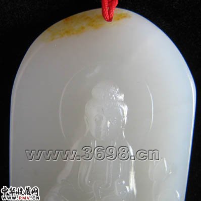 此一款精品观音牌由新疆和田仔玉料精琢而成,玉质白润细腻,带有美艳罕见的撒金皮,皮艳肉细,值得收藏。总重37克,款形大气,更适合男士佩戴。