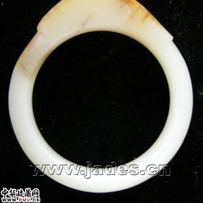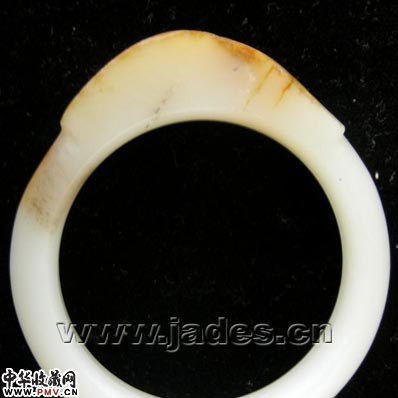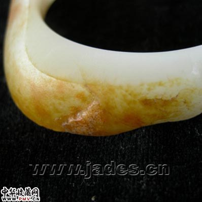 明丽的黄皮油润养眼,与白嫩的玉质相互映衬,更显得清丽可人。黄皮部分刻意保留,如同一个戒指的戒面般鼓起,很有装饰效果。佩戴于腕间,闲时观赏那精美油润的皮子,是一种美好的享受。