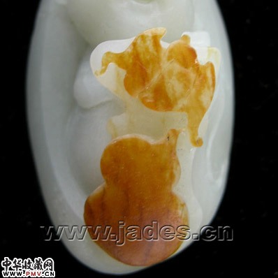 笑佛面前巧用美艳的黄皮摘雕着一只栩栩如生的蝙蝠,蝠同福,寓意幸福,下面一只精致的小葫芦,摘色干净迷人,十分讨人喜欢。