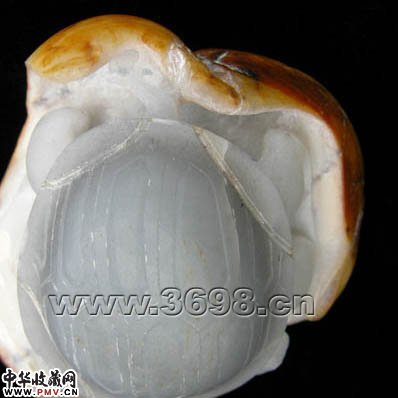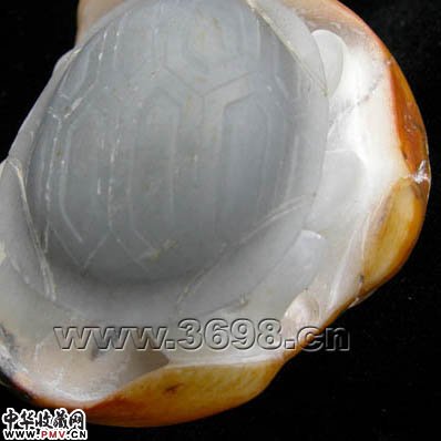 和田玉籽料----富贵百年,质地致密,玉质细腻柔润,光洁度好,颜色过渡自然。巧用青花料精琢龟背,白色的部分巧琢四只脚和头部,浓艳的黄皮作底相托,使作品显得结构紧凑,和协完美。