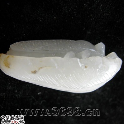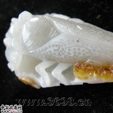 整体琢制,精心巧雕一只知了趴伏于一片叶子上,知了雕刻细致生动,一丝不苟,另一面一片硕大的叶子,旁边俏色黄皮摘雕一只蝙蝠,整体布局完整,佩戴把玩令人爱不释手。