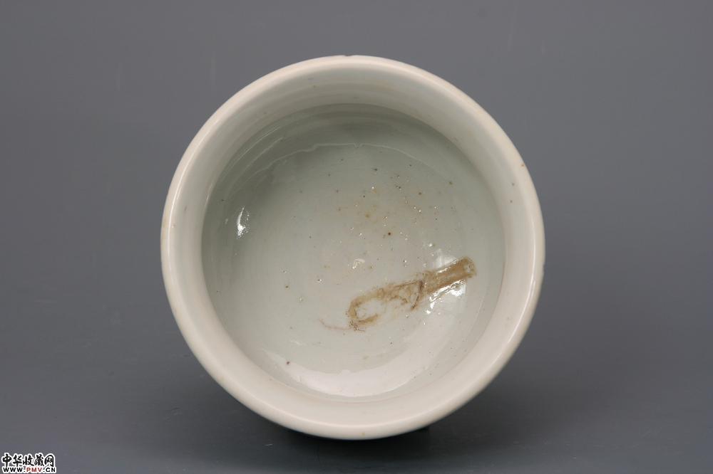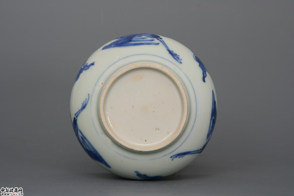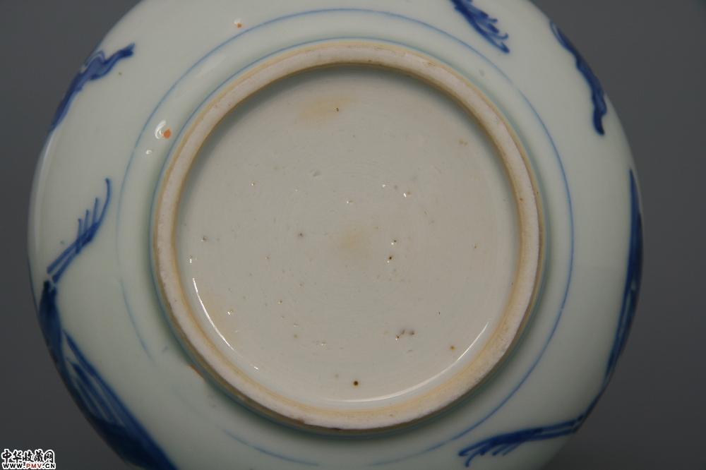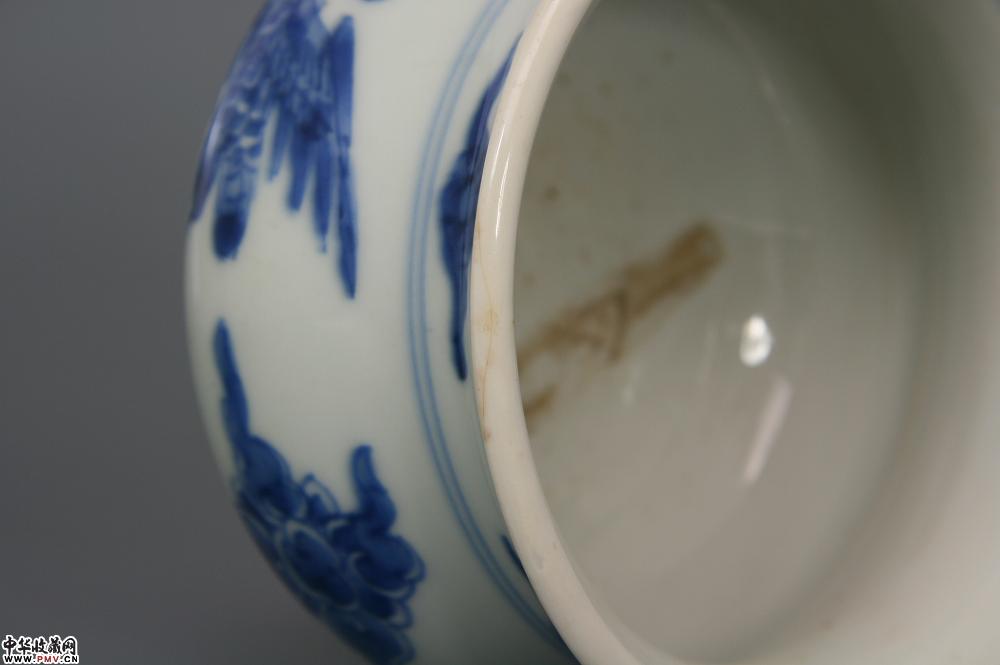 高8.4cm,口径12cm,底径7cm。口沿外翻成卷唇,束颈,鼓腹,圈足;通体施亮青釉,釉层肥厚有光泽,外腹以青花绘制云鹤纹,青花发色亮丽,呈色蓝艳,为康熙中期物,口沿有小磕。