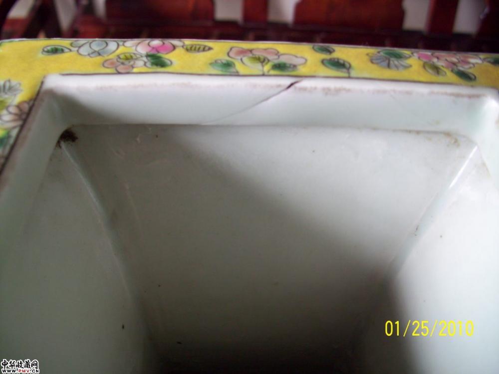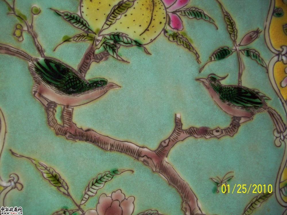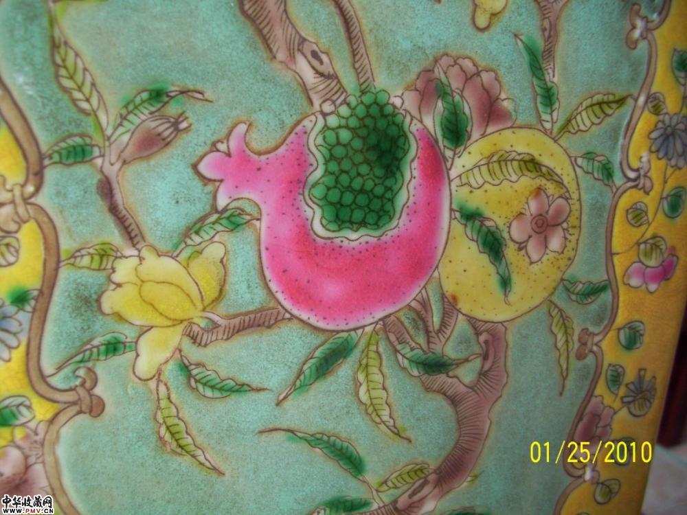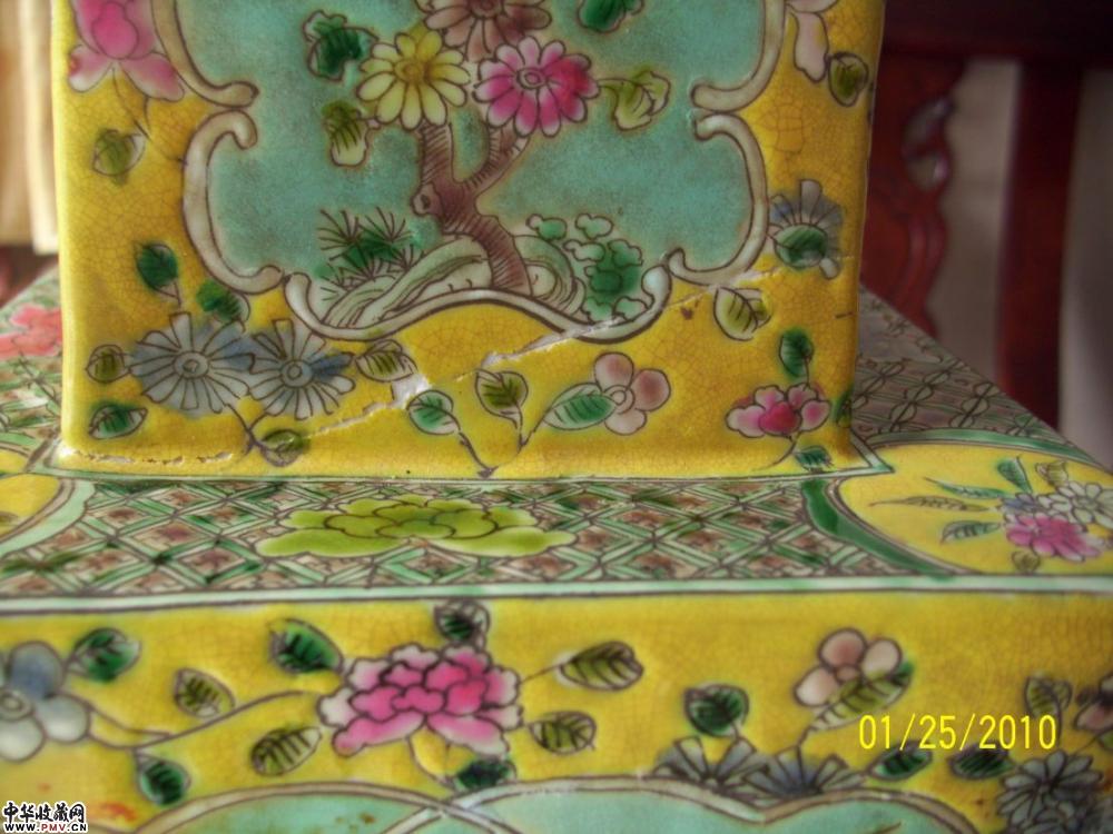 清 绿釉开光粉彩花鸟纹方瓶