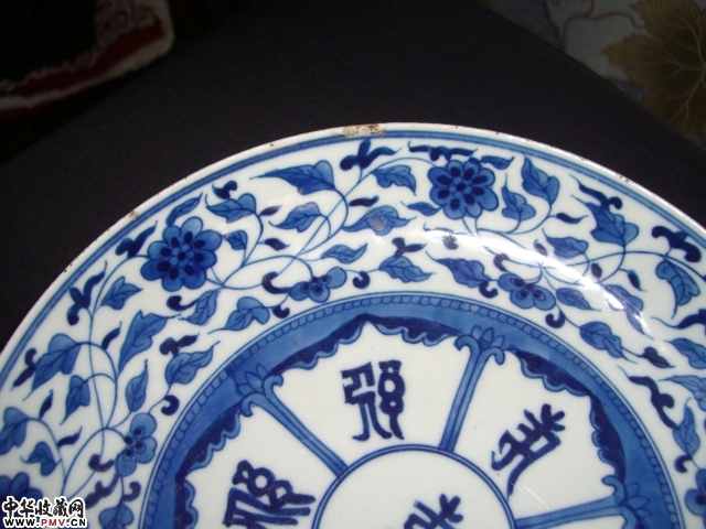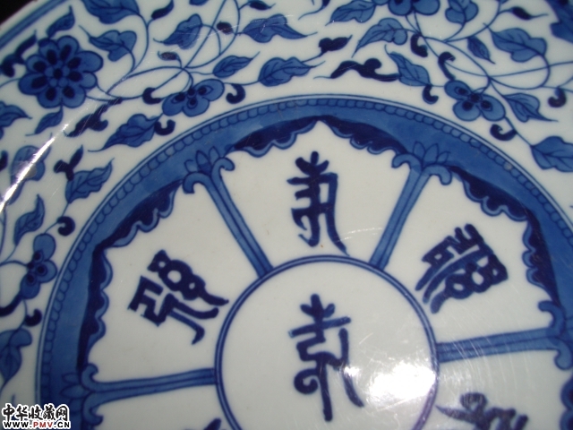 特征-胎质洁白,胎体轻薄坚致,盘型秀美。青花纹饰精湛,用排列正齐的瘦体梵文满饰盘内底面,内壁饰缠枝莲,盘外腹饰梵文一周。底青花双圈内青花楷书-大清雍正年制。口沿稍有微磕。珍罕。
