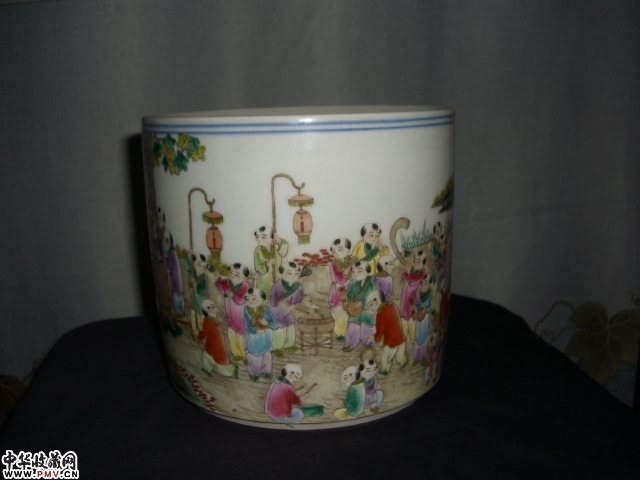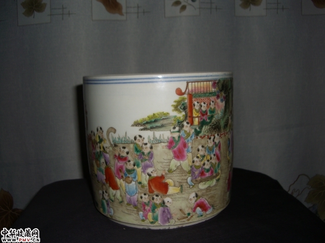 尺寸:高17,口径19,底径16.5厘米。白胎,青白釉,五彩,直口,平底施细纹。外壁绘百子爱琴棋书画游乐图,一排喜气洋洋,生机勃勃景象。