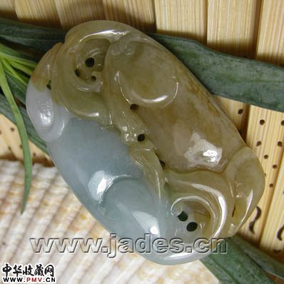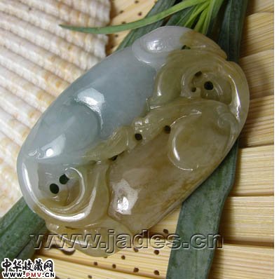 此一款玉件由缅甸翡翠A货琢制而成,玉体为黄翡及紫罗兰两色,双色分雕獾,獾獾相依,取其谐音,寓意双欢。