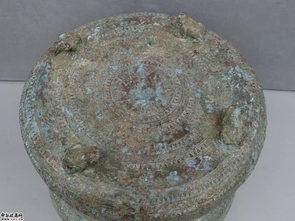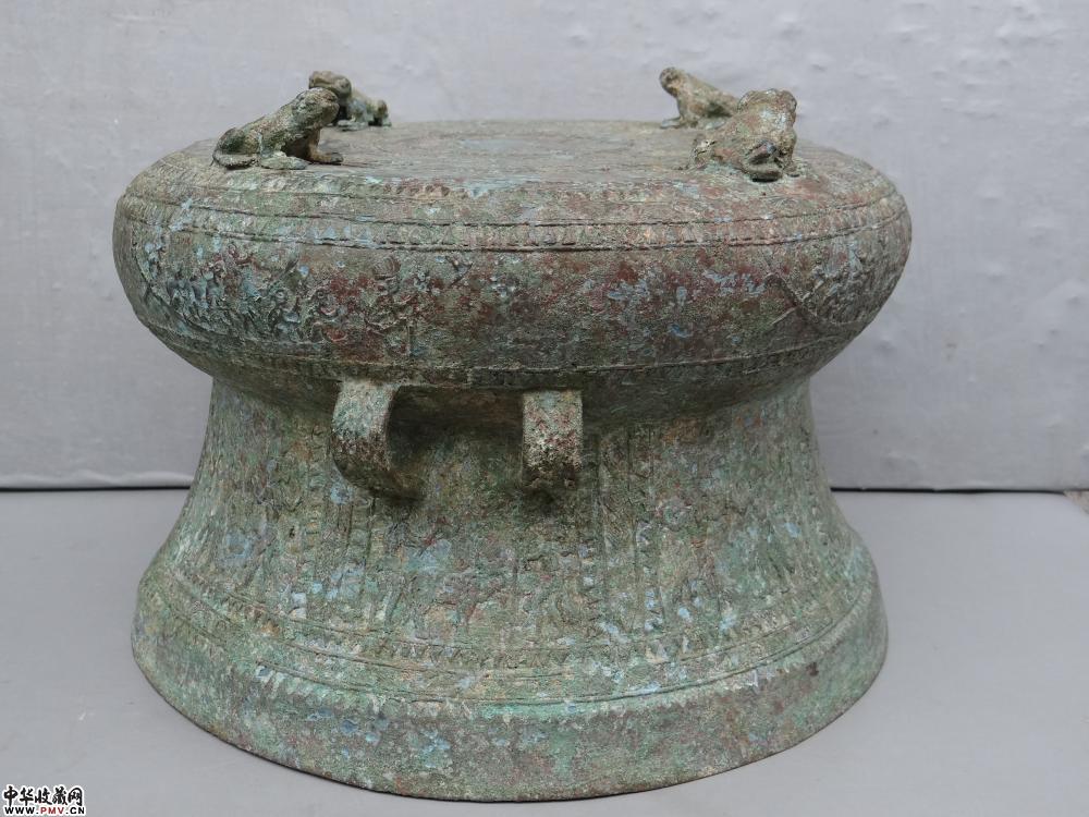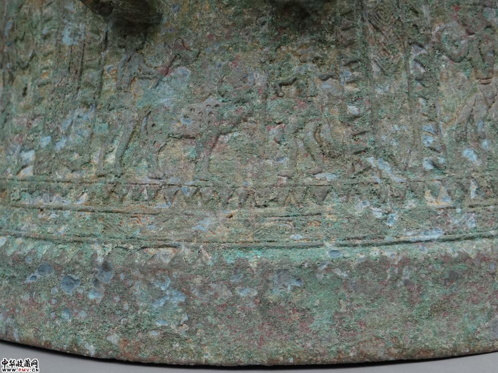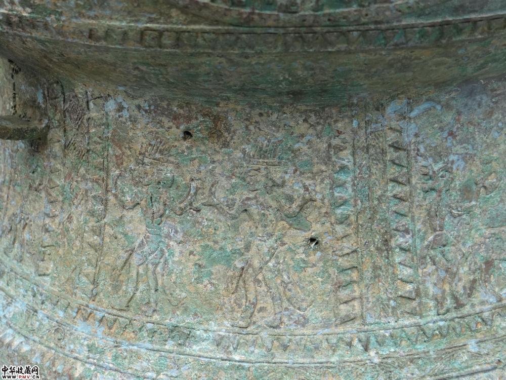 本藏品鼓面28厘米、底径29厘米、高18厘米,有一小缝 (图中可见) 。是石寨山型小铜鼓,鼓面不出沿,腰内收成筒形,单环双小耳,腰部刻有渡船纹和羽人舞蹈纹为主。