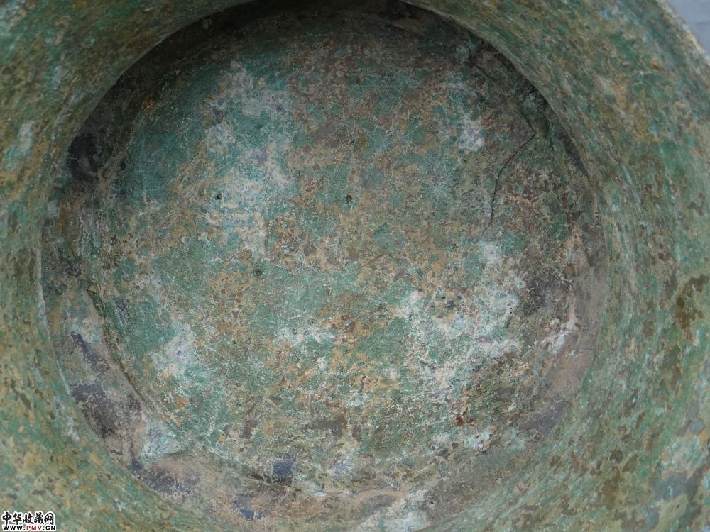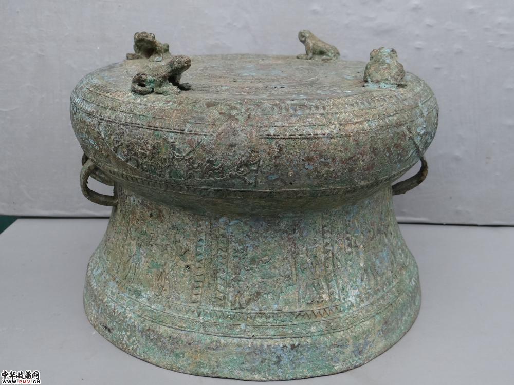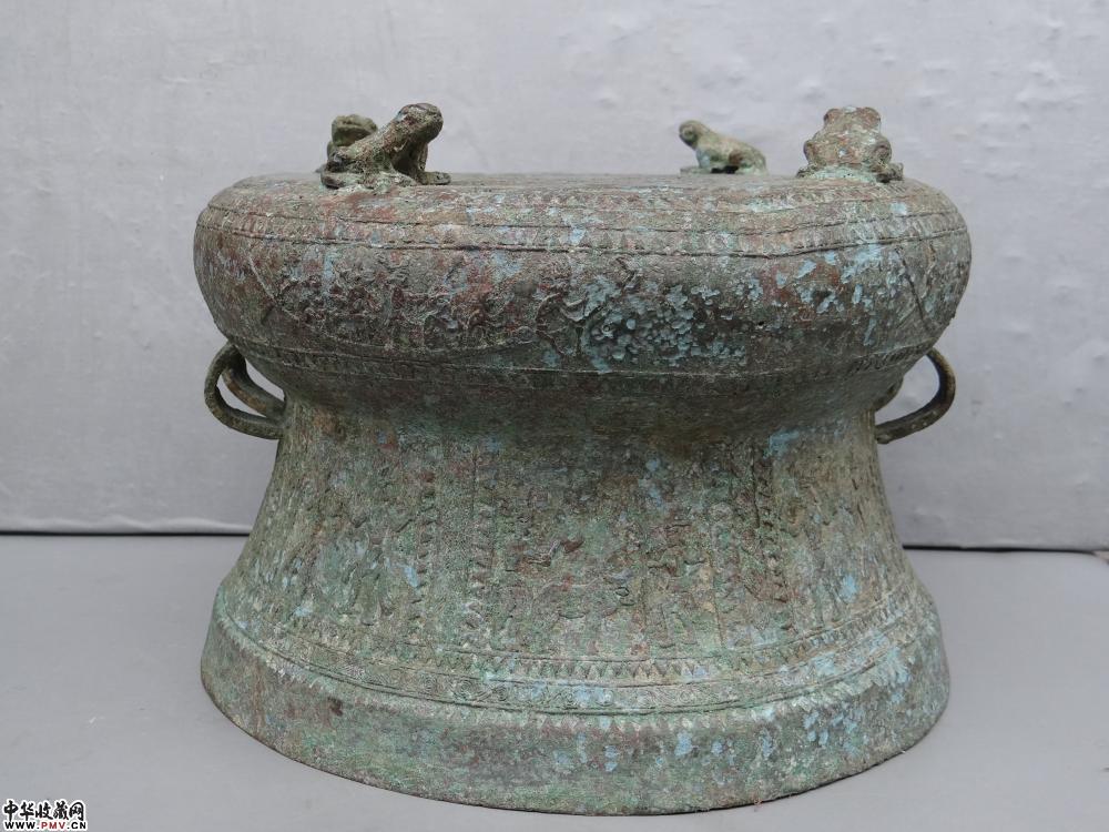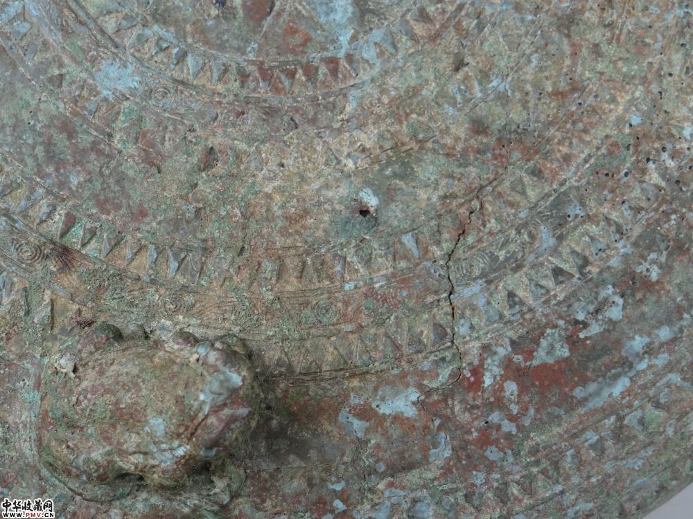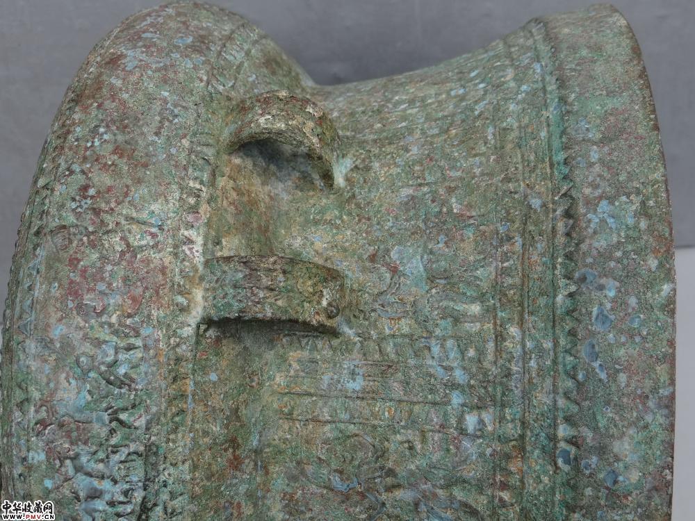 本藏品鼓面28厘米、底径29厘米、高18厘米,有一小缝 (图中可见) 。是石寨山型小铜鼓,鼓面不出沿,腰内收成筒形,单环双小耳,腰部刻有渡船纹和羽人舞蹈纹为主。