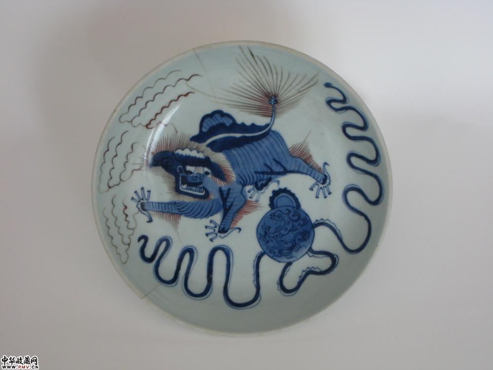 清早期 青花釉里红狮子滚绣球纹盘