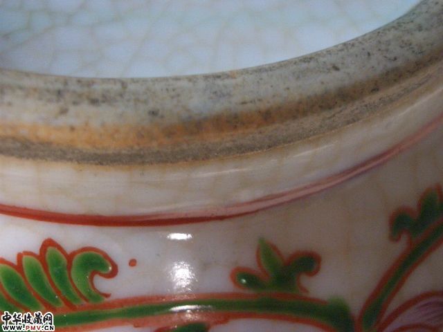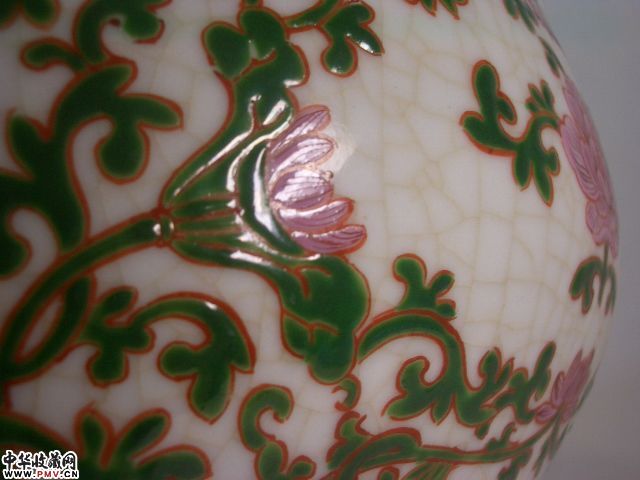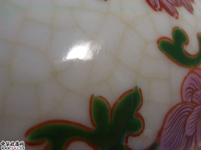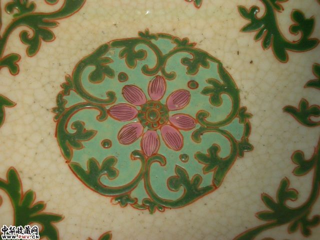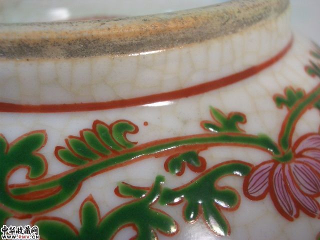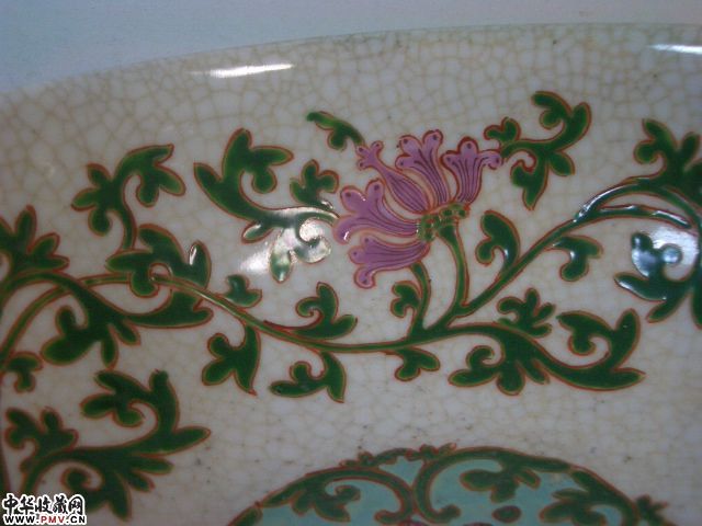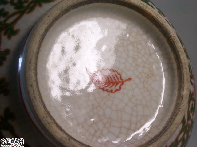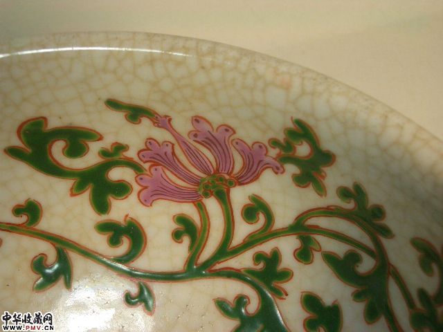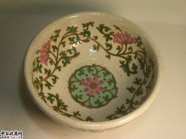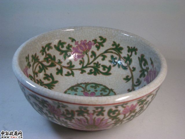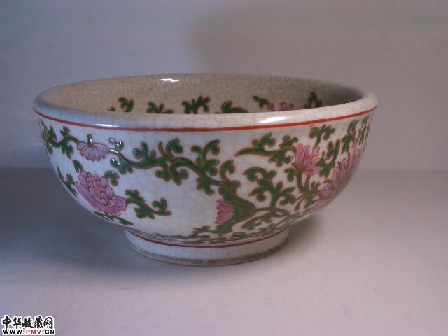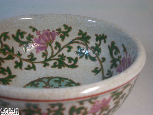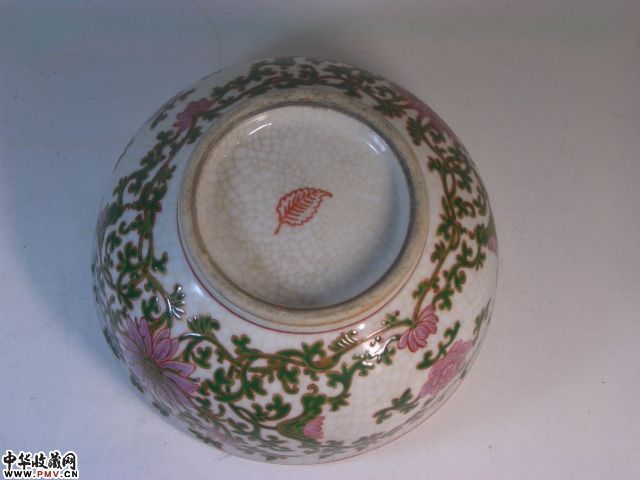 品相:尺寸大,哥釉地,碗里碗外均粉彩描绘缠枝花,彩头靓,器形稳重,酥光内敛,底有树叶款记,值得赏玩。