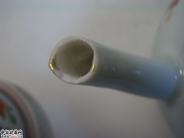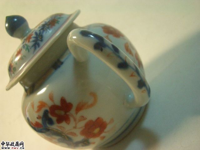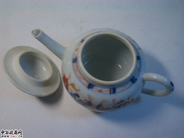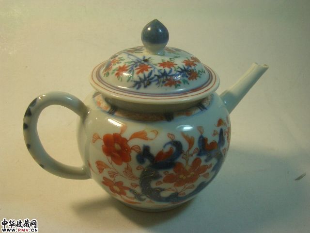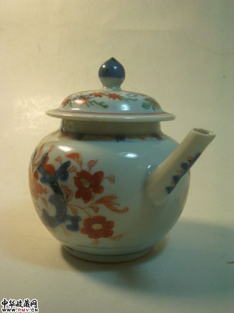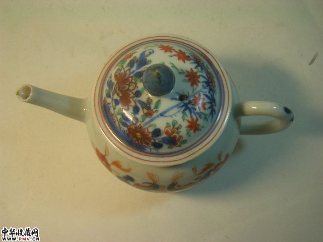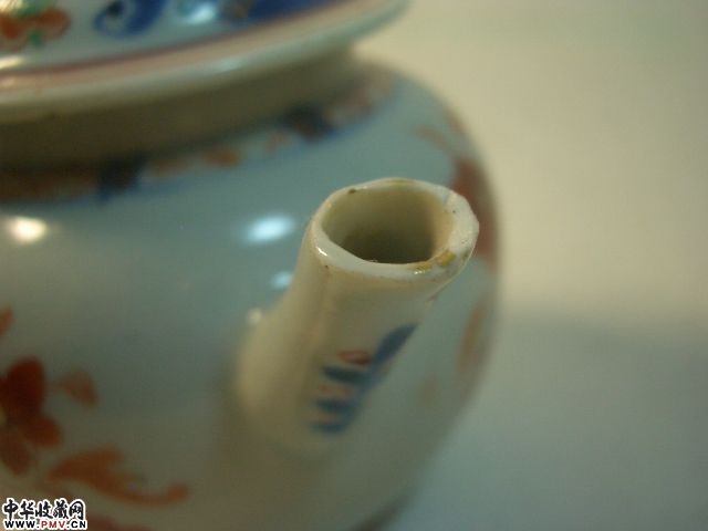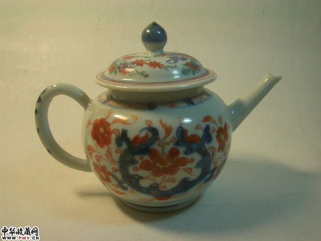 品相:清乾隆青花矾红花卉茶壶,胎坚釉莹润,青花矾红构成传统纹饰(局部描金),甚具朝代特色,除壶流嘴有小飞皮,盖钮有老伤外其余完好,值得收藏。