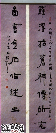 林散之先生读《艺舟双楫》、《书镜》、知“书法备于正书,溢而为行草”,遂致力于临欧、颜、柳诸家,日课百数十字,进而上窥汉隶、魏碑、晋帖等,林散之先生曾临写过《张迁》、《礼器》、《曹全》、《乙瑛》、《衡方》等汉代名碑,打下了坚实的基础,从这幅隶书对联中,我们还隐隐约约地可以看出以上诸碑的影子,但又完全是林散之自己的风格。结字多呈长方形,有的笔划长枪大戟,有的短促聚力,虽是隶书,但又揉入了行书的笔意,故而活泼又有力度,如果林散之先生将精力再多投入一点到隶书中去,使之再完备些,作品再多些,林散之隶书的地位将会大大提高,或开一代风气也未可知。