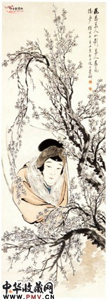 人物画家在画人物时,有时为了避免单调,往往将人物置于一种精心构置的氛围和环境中。此《梅花仕女图》就是将一妩媚清丽女子的倩影安置在高洁清雅的梅影中,二者相得益彰,互为衬托,更能表达画面意境。