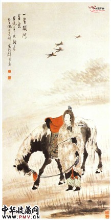 北图画题:"一望关河萧索。宣统辛亥新春。"可见作于1911年。王昭君名嫱,汉代美女。汉元帝后宫既多,不能常见,乃使画工图形,按图召幸之。诸宫人皆贿画工,独王嫱不肯,遂不能见。匈奴入朝求美人为阙氏,于是按图以昭君行。元帝见后,貌为后宫第一,善应对,举止娴雅,帝悔之,而名籍已定。《昭君出塞图》为历代画家所重视。过去的"百美图"上常见此图。画面上昭君是以公主打扮,裘皮斗篷,立于马前,若有所思,仰望天空。