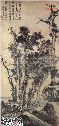 "入春连月雨淋漓,一日雨晴春亦深。碧沼平添三尺水,绿榆新涨一池荫。"这件山水小景是画家在阴雨初晴之时所作,以纪事且记情。画中描绘了一雾气弥漫的平沼近岸,碎石散置,绿苔满布,细草丛生。数棵杂树相簇,绿叶枯枝,相互扶助。此作笔法宽厚,墨色浑润,浓淡变化,层次丰富,虽为小景,但亦显得境界开阔,气势厚重,有翠湿欲滴之意。