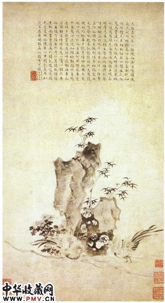 此图描绘笔墨苍润劲健、朴茂多姿,同时又端庄工丽,是文徵明的经意之作。画面精心安排有竹、菊、石和一只生机勃发的斗鸡。画中新篁含风,竹竿行笔遒健劲利,竹节之间,笔意贯穿,墨色停匀。全图物象不加淡墨烘染,更见明快爽朗。特别是吸收书家笔法的节奏,韵律,轻重徐疾,提按顿挫富有变化。