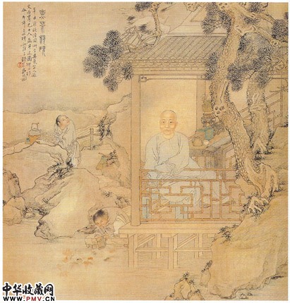 此画在两株虬曲的松树下,有傍石而建的水榭,一中年男子倚栏而坐。榭内琴桌上置有茶具、书函,一侍童在水边涤砚,数条金鱼正游向砚前;另一侍童拿着蒲扇,对小炉扇风烹茶。人物线条尖细挺劲,转折硬健,师法陈洪绶而不受所围,其技法已臻纯熟,仪容闲雅,设色清淡,为清末海上画派的风格。这是同治十年(1871),作者三十九岁时,为友人文舟所作的肖像画。