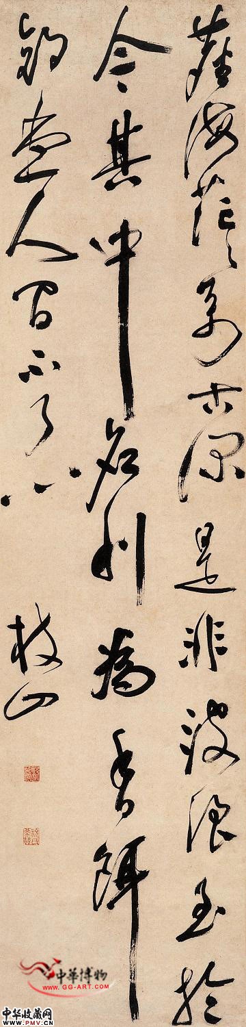 按语:祝枝山的书法,在有明一代极负盛名,有“国朝第一”之称。尤其是他的草书,纵横跌宕,奔蛇走虺,不可羁勒。他摹古功力极深,又不甘为奴书,张扬个性,开拓新风,使他在晋唐人之外,别开生面,独树一帜。文徵明曾自称“不及其万一”,可说是佩服之极。此轴用笔沉酣朴茂,布局疏密有致,左右二行用笔急,结体紧,字距密;中行则疏朗舒缓,从容不迫。通幅张驰相间,极有节奏感和空间美感。明人文震享称他“生动之中不失准绳,”文嘉说他“法意咸备”,“得张颠之雄壮,藏真之飞动,”从本幅中可以感觉到这些特点。