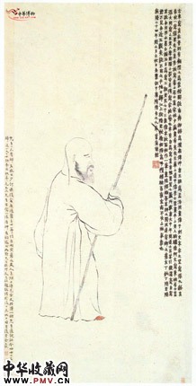 纸本。水墨。作者自画白描像,左手扶藜杖,作向前行走状。其疏髯高额的外貌特征和“癖古嗜奇”的气质,刻画入微。尤其脑后的一束发丝和手中的长杖,更是生动传神。作于乾隆二十四年立秋。自书跋六行于右,城“衣纹面相作一笔画”。现藏故宫博物院。