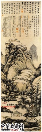 此画营造了一种山水亭榭,林泉雅集的氛围,远处峰峦陡起,轻披薄雾;近处山顶与中部山腰露出多处缓缓向上的台地,泉水从山涧飞流直下,汇成棕棕小溪,溪水旁有一小桥,茅亭内四人席地而坐,书童侧立一旁正听候主人吩咐,一老者拽杖而来。山上山下,草木葱茏,叶红似火的枫叶点缀其间,更添几分胜地雅集美景。画家皴染兼施,构筑的画面气魄雄浑沉静,画心连画家共六人题咏,实为诗书画熔为一炉的山水佳作。