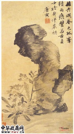 此图用笔抑扬顿挫、自由洒落,落墨清润华滋,浓淡得宜,塑造了一突兀奇峭而造型别致的湖石,左边所绘花卉既能点缀巨石,又起到平衡整个画面的作用。整幅作品,秀逸疏简,意趣清丽劲爽。